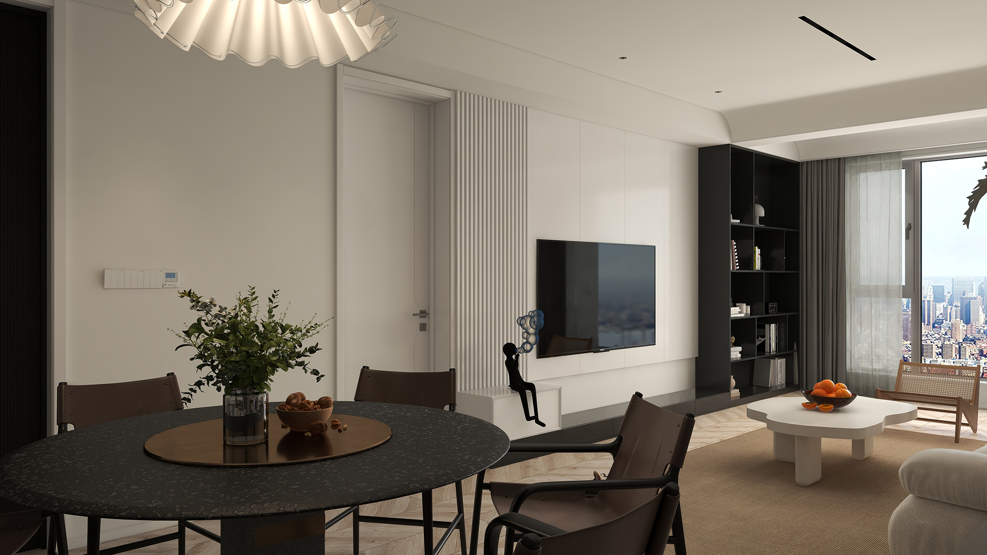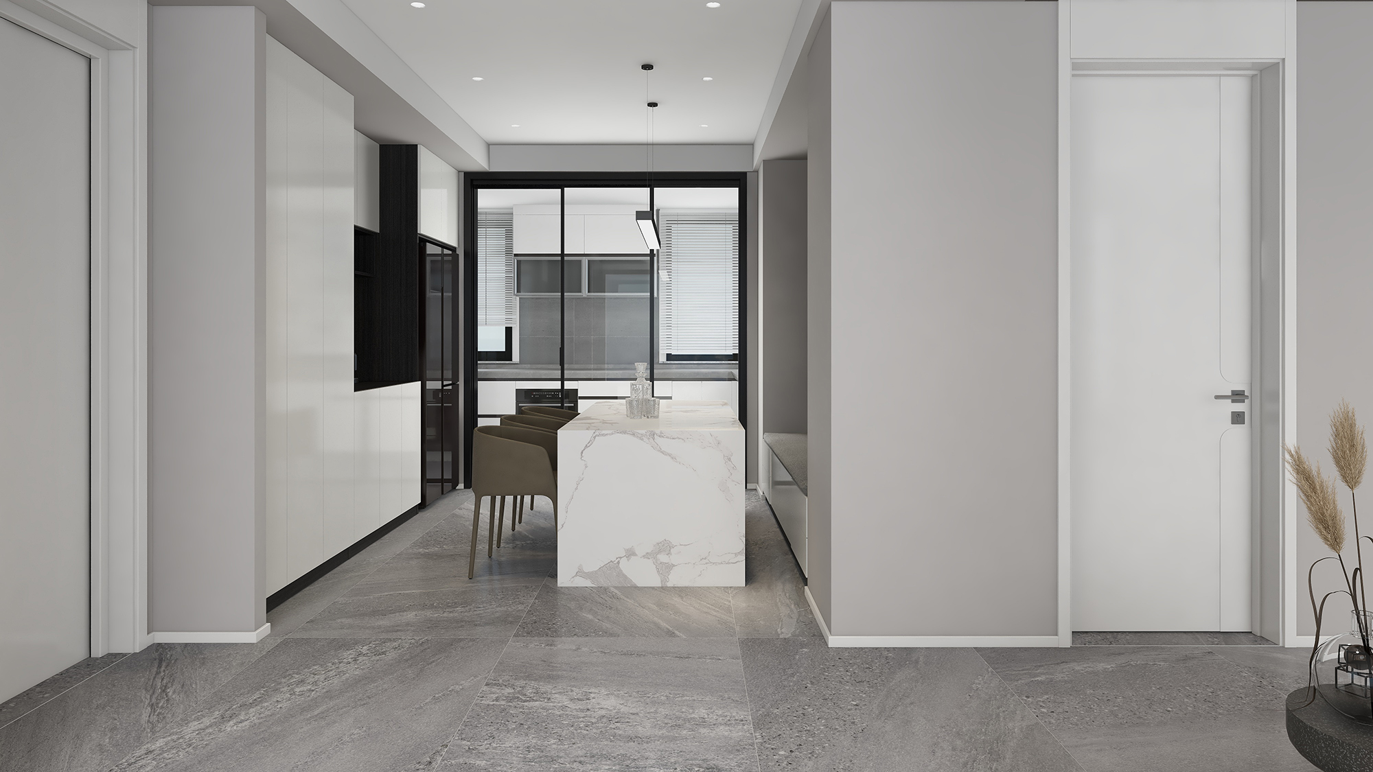 巧妙的线条造型,视觉上实现场景折叠变化,让空间不在单调,贝母白,用贝壳颜色,白色中掺杂灰色调,简约又不失高级。
