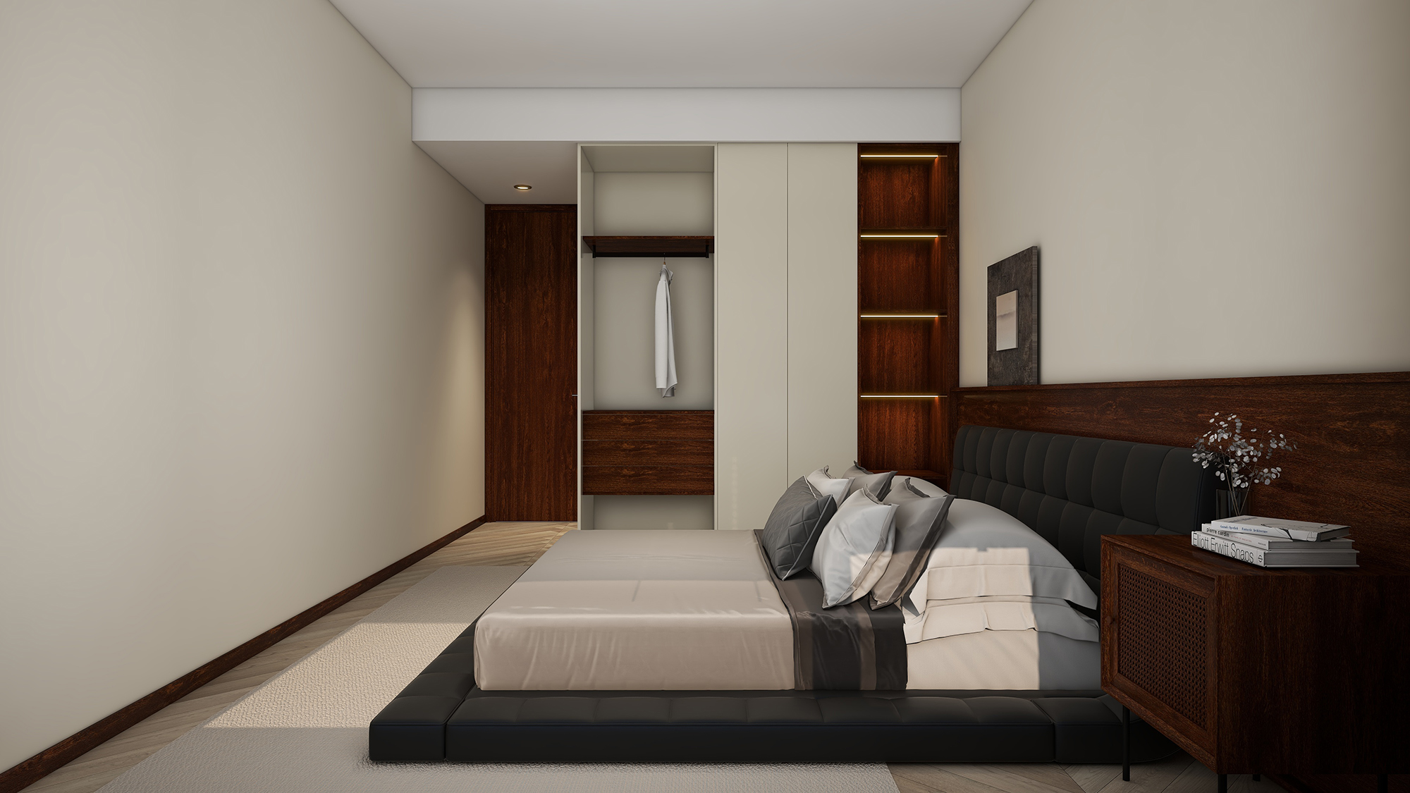 全屋以奶白色为基调,大面积运营低饱和度的色彩,与沉稳的木质元素融会贯通,不同的材质剪碰撞出自然的格调。像TATA木门的金楸色材质也是个不错的选择。