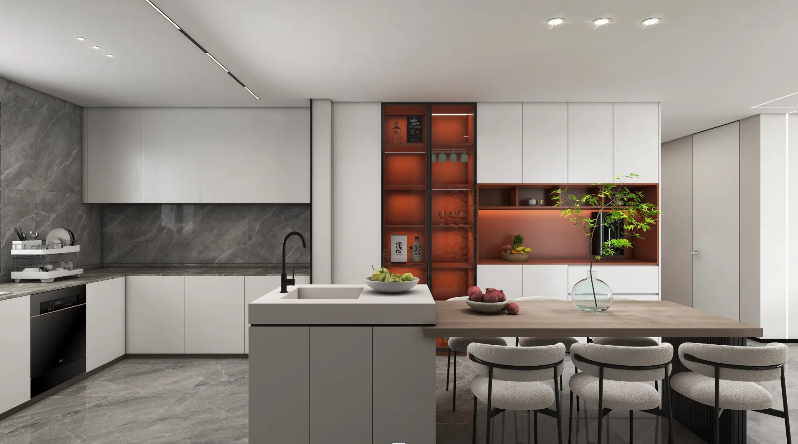 软装可搭配些许热烈活泼的莫兰迪橙,提升视觉亮度,隐形门加强客餐空间的整体性,营造复古又不失趣味的氛围。