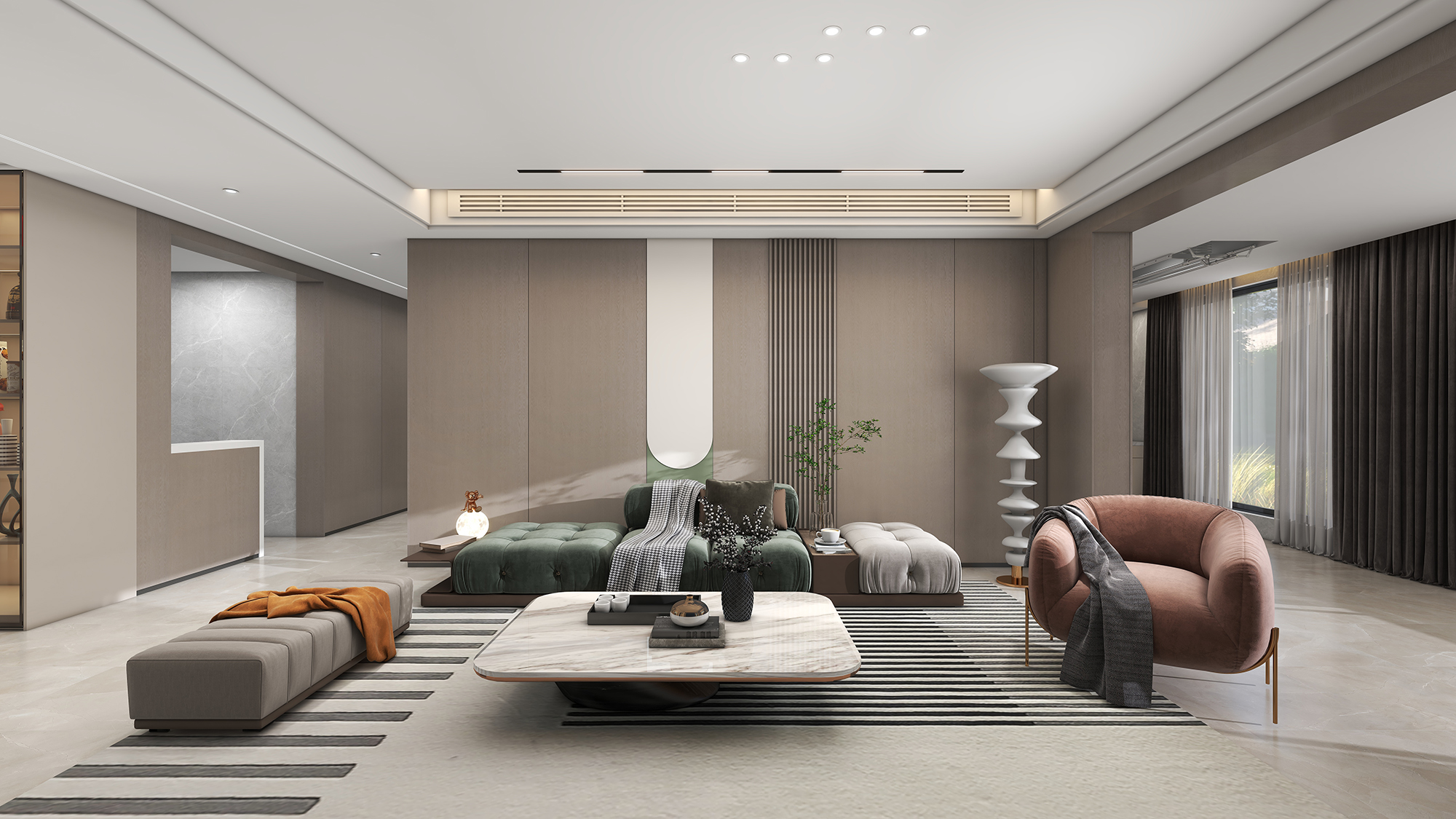 藕荷色自带甜而不腻的温柔韵味,藕荷色系墙板搭配复古棕沙发,初秋氛围与现代轻奢完美融合,丝滑的质感充满秋日气息