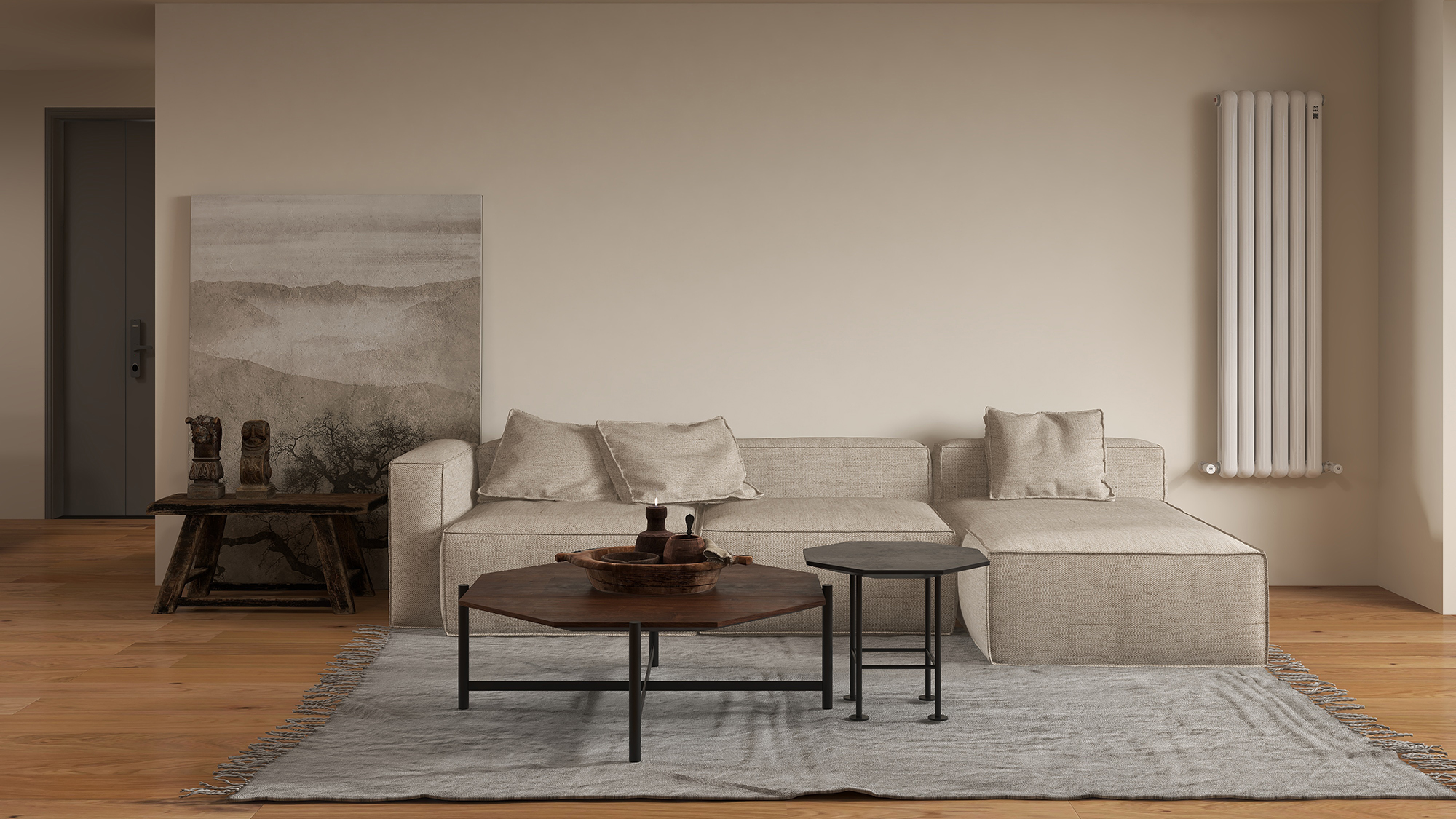 浅色“美拉德风格”以杏色,卡其色为主,这样的客厅有一种温润的气质。如果觉得色调单一显得空旷,可以搭配烟熏尤加利木门,丰富视觉层次感。