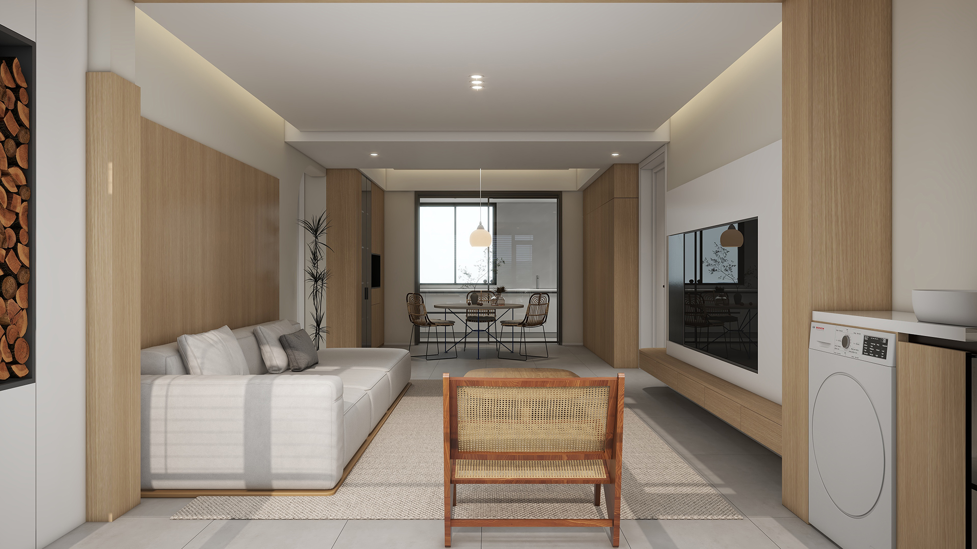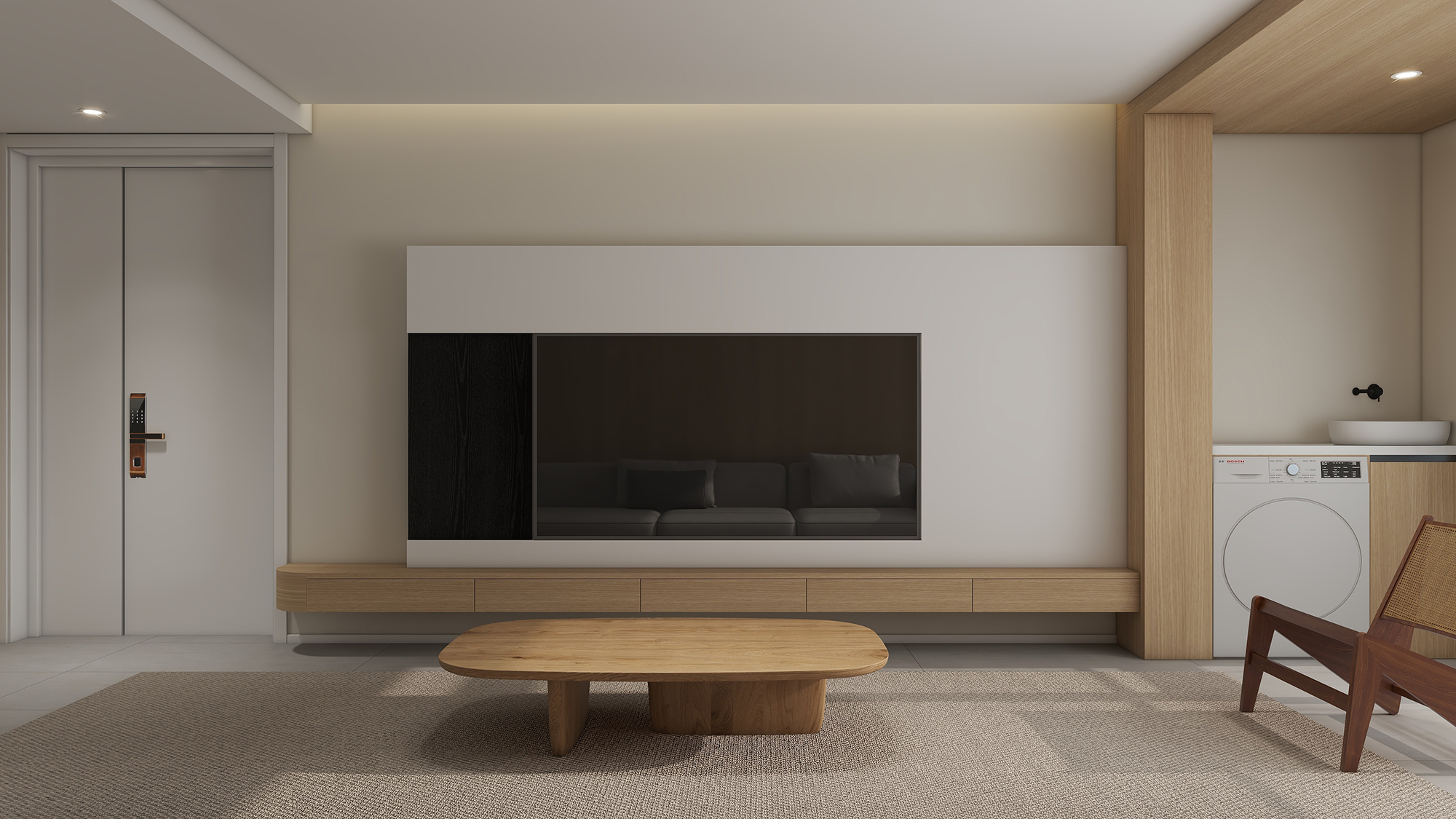 冷色调空间设计,纯色电视背景墙结合窄边透明推拉门低饱和色调营造室内通透性,延伸空间感,拍照自在ins风滤镜。