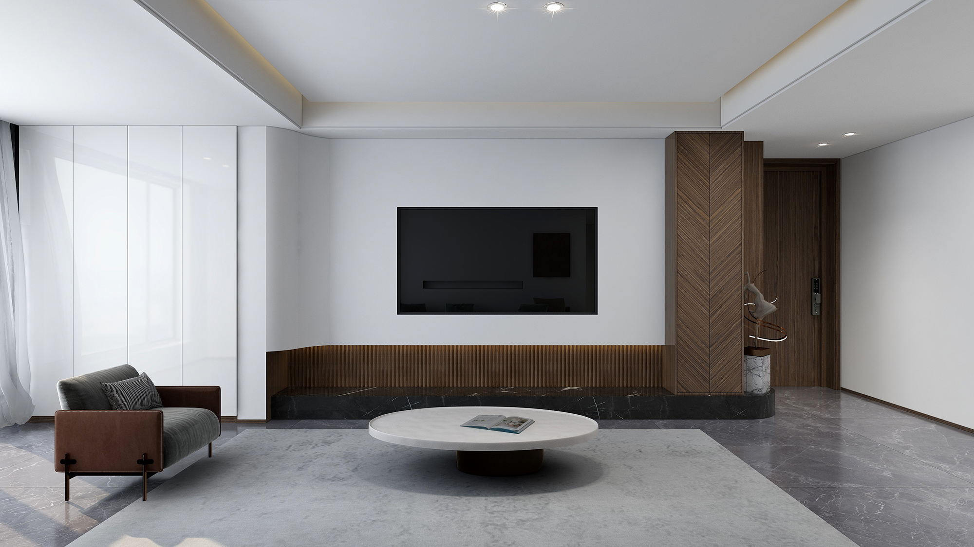 整个方案是以现代简约为主格调去设计,使用烟熏黑胡桃去贯穿整个空间,但是为了空间的舒适性和简洁性,大部分墙面采用白色乳胶漆,这样使整个空间看起来更加整洁明亮;软装更是选用极简的皮质沙发和大理石小茶几去搭配,突出整体时尚简约感,同时全屋采用无主灯设计,搭配装饰灯带,让整个空间的层次感更强。 业主是三十几岁的具有现代时尚感的女士,要求整个空间要突出一种意式极简的风格,所以我们采用烟熏黑胡桃的主色调去搭配,大部分空间留白;同时采用石膏板造型,内嵌灯带,看起来简约时尚。