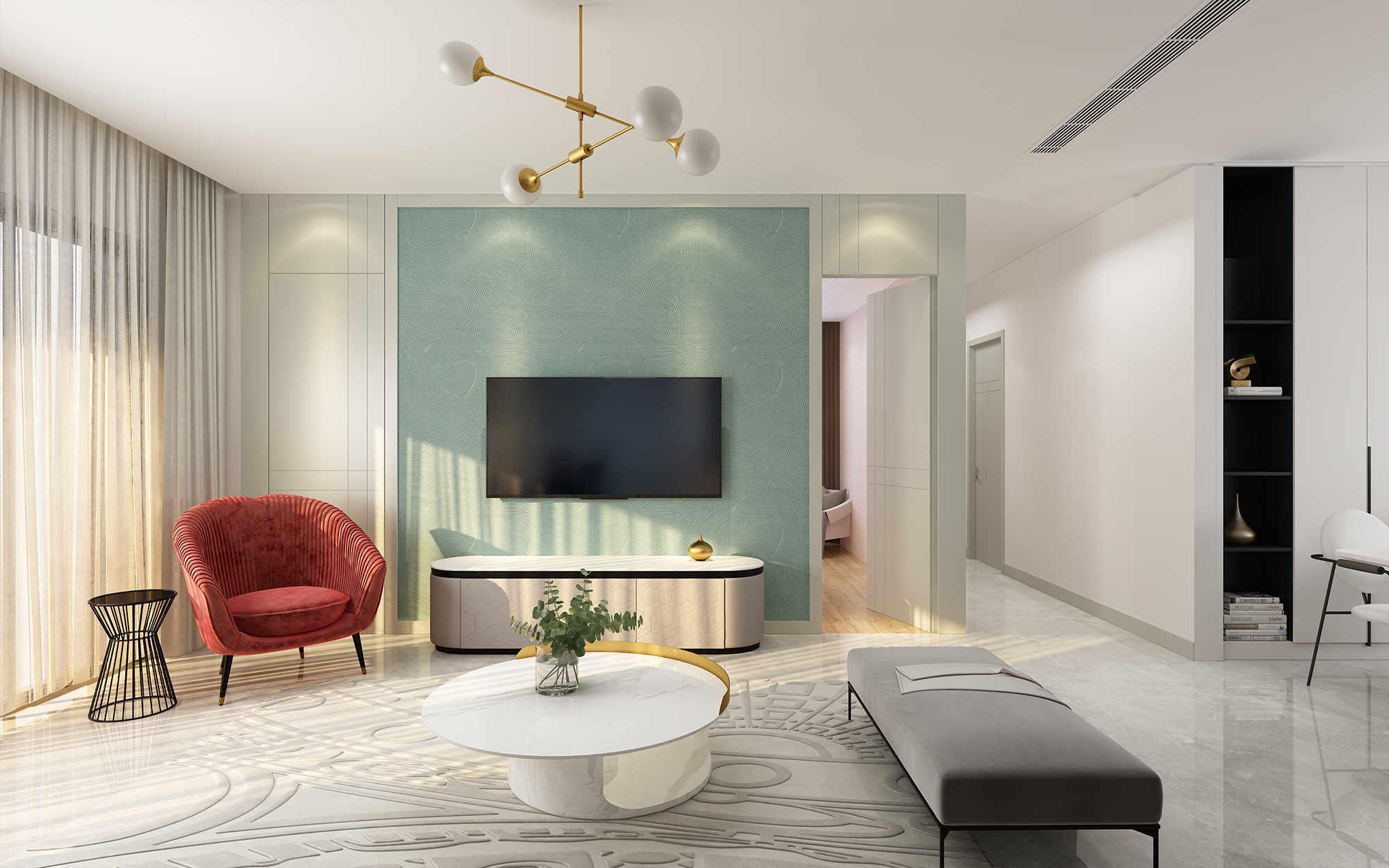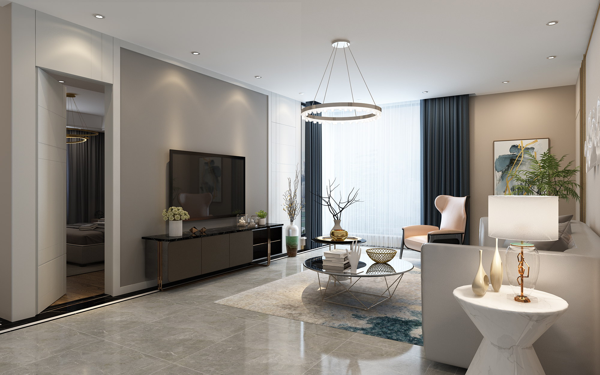 隐形门与客厅电视背景墙融合连贯,延伸至卧室间内,利用板材代替墙体,干净利落的造型更让人倍感舒适。隐形门同时更具有私密性的空间,再不轻易被人发现的同时,成为全屋设计的亮点之一。