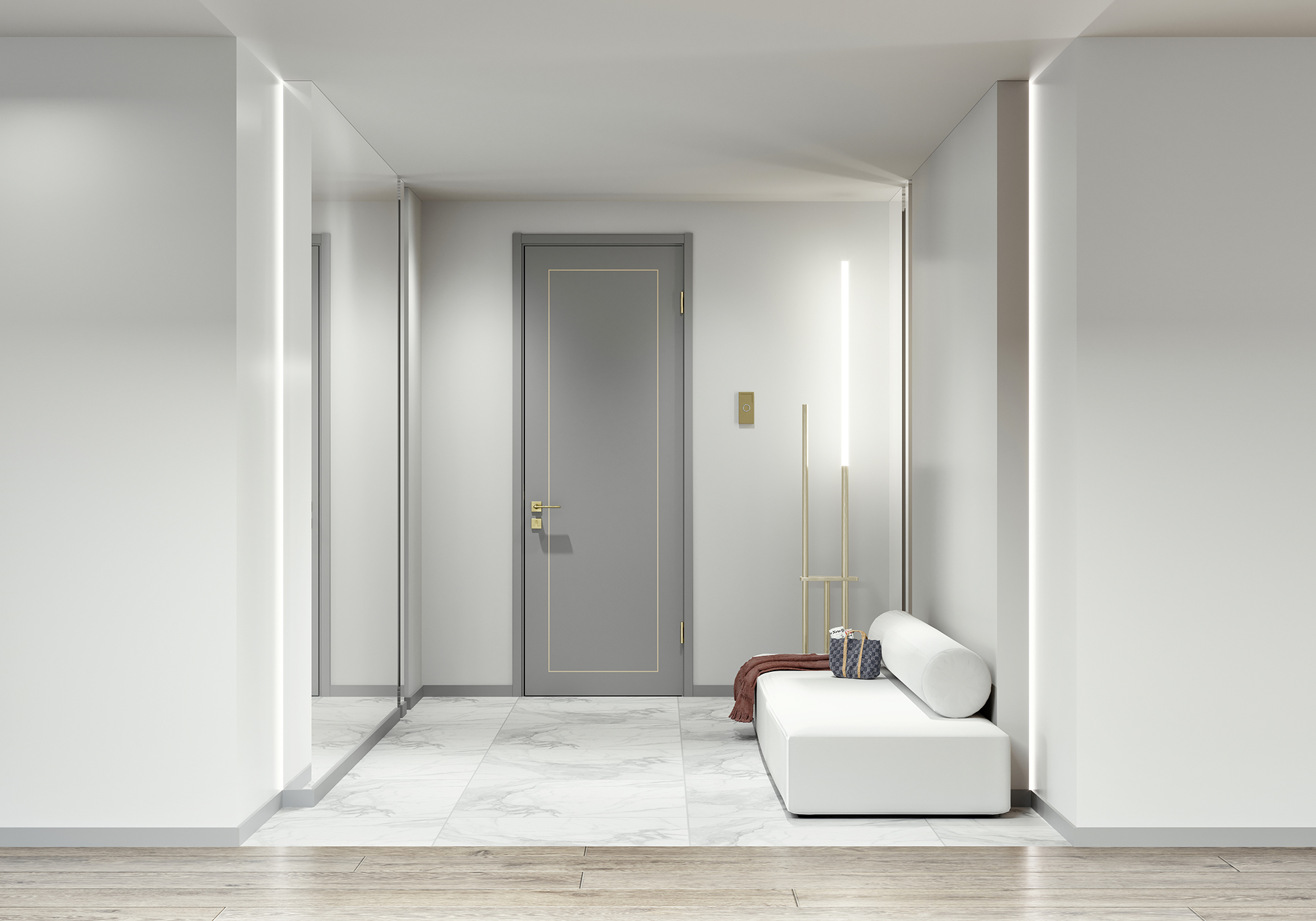 不想要复杂的造型,也不想要太普通的平板门,可以闭眼冲这款。莫兰迪深灰门扇搭配金色的金属线条,灰色稳重而又温润,中性而不平庸,妥妥提升整体空间的精致感。