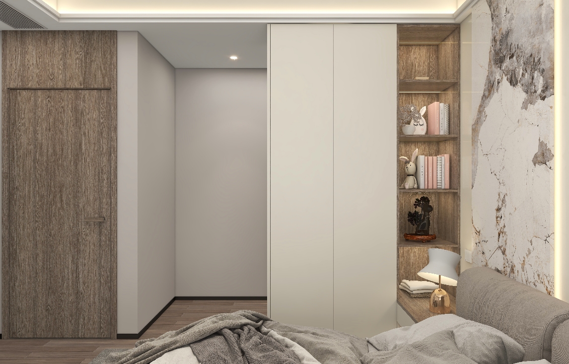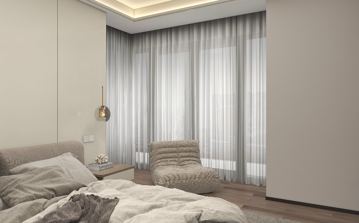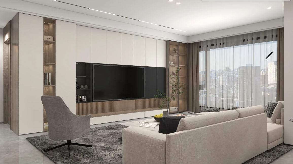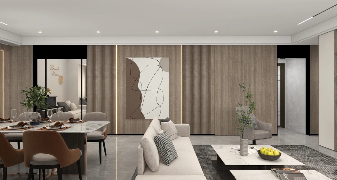 根据业主的需求点出发进行选品设计,按照丁香棕+暖灰一号的材质,对全屋系统打造。