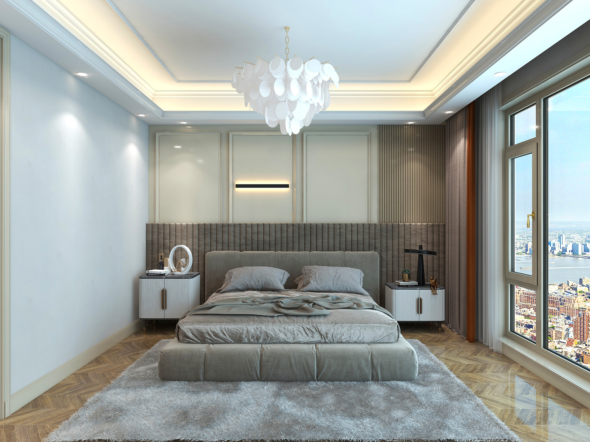 卧室是回到家,最能静下心来休息的场所。整个场景同样采用奶油色调,营造出温暖的居家感受。采用木质地板与家具,给人一种亲近大自然的温馨感。定制背景墙下方,增加了毛绒布艺的设计,与现代简约的元素巧妙搭配融合,展现出独特的装修风格。