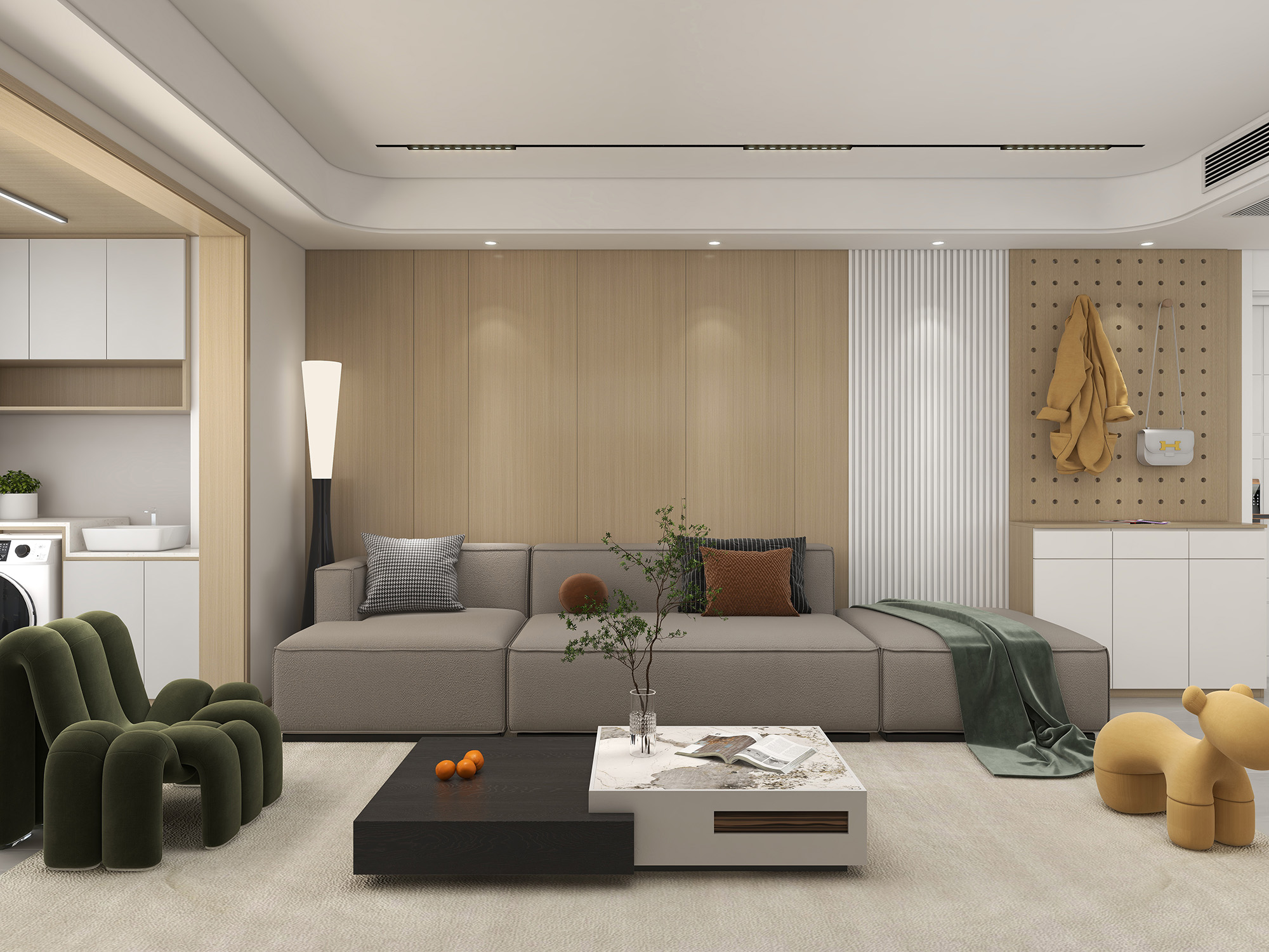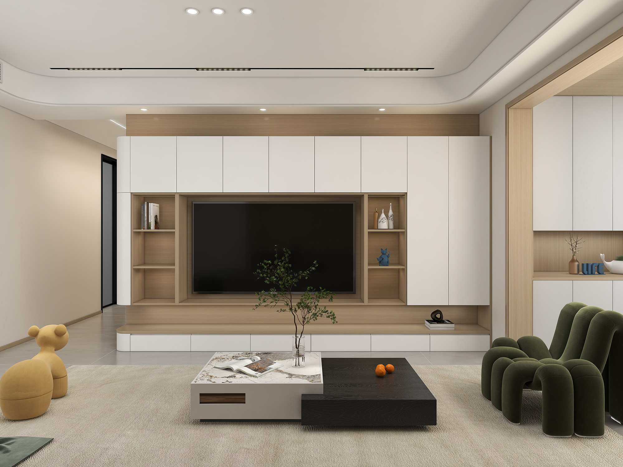 以现代简约风格为主,设计根据动静分区的原则对空间进行了休息区域与活动区域的空间划分,使其在功能上更趋合理。