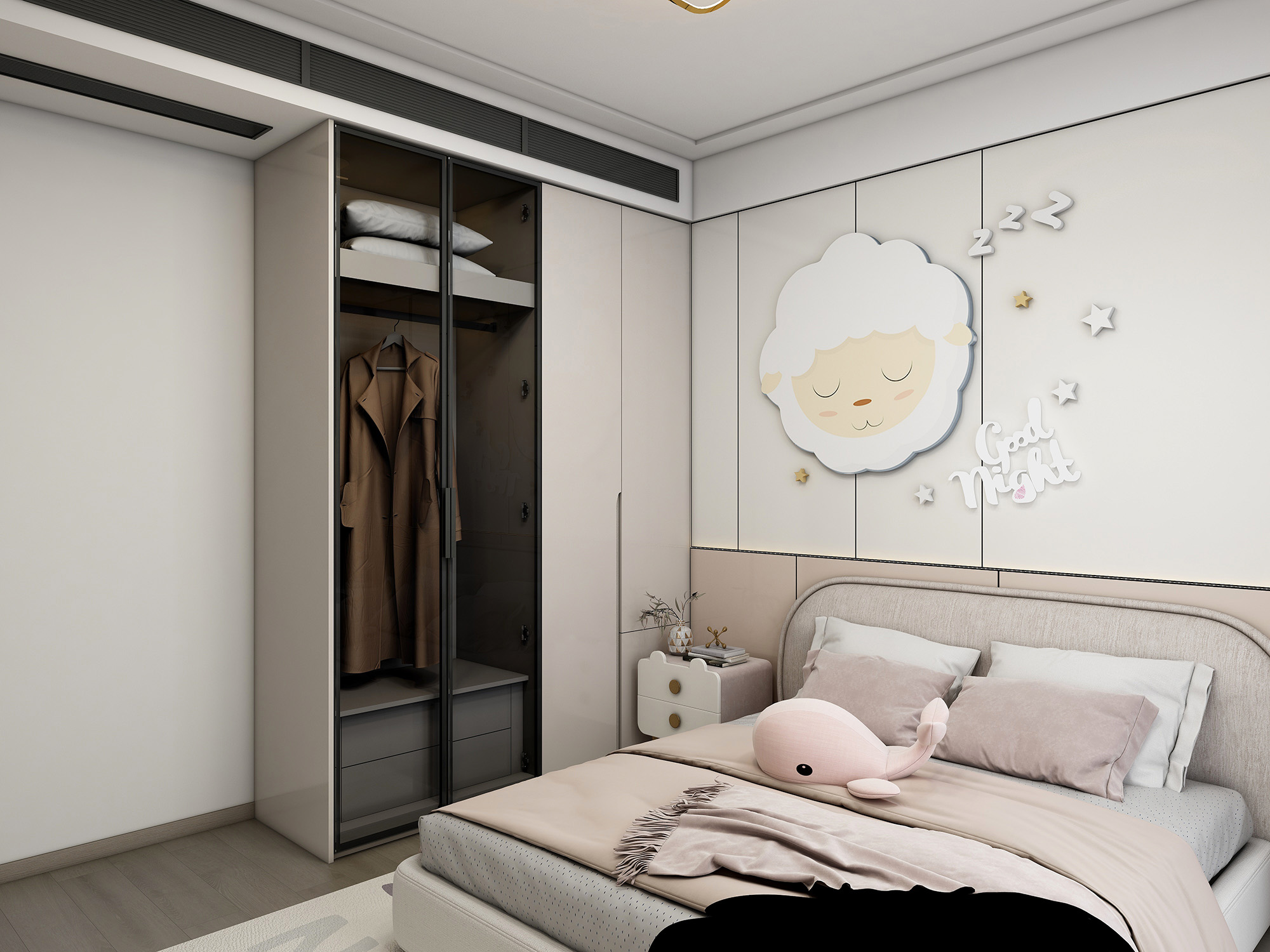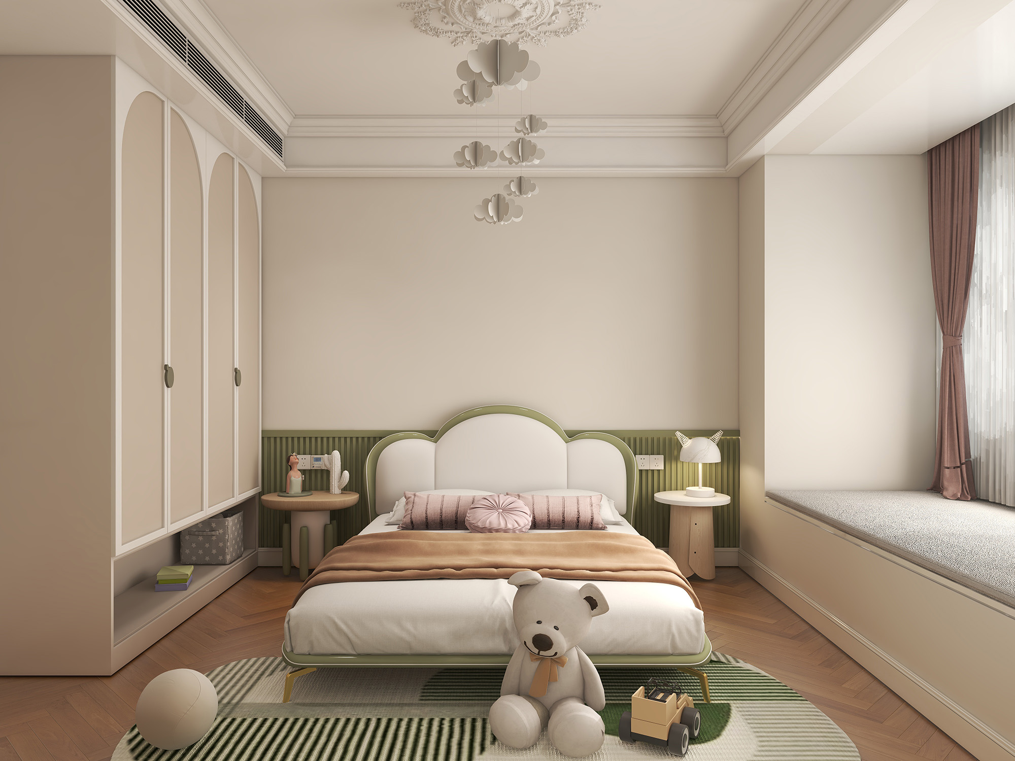 利用圆弧元素处理边角,既能预防磕碰受伤又显得可爱有童趣。衣柜的圆拱设计外观充满法式轻浪漫,为房间增添不少精彩。飘窗作为阅读和休闲区,方便孩子日常在这里看图、放松。