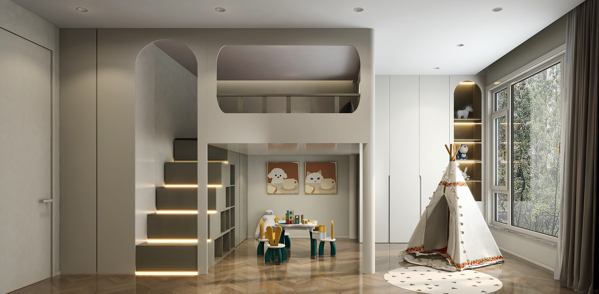 房间内留有足够的空间让孩子能够尽情玩耍,也方便父母陪伴。将楼梯下方的空间定制成收纳矮柜.孩子拿取绘本也能够得着。床铺安装防护栏,边角采用圆角设计,定制柜采用无把手设计,将可能出现的磕碰情况一一规避。