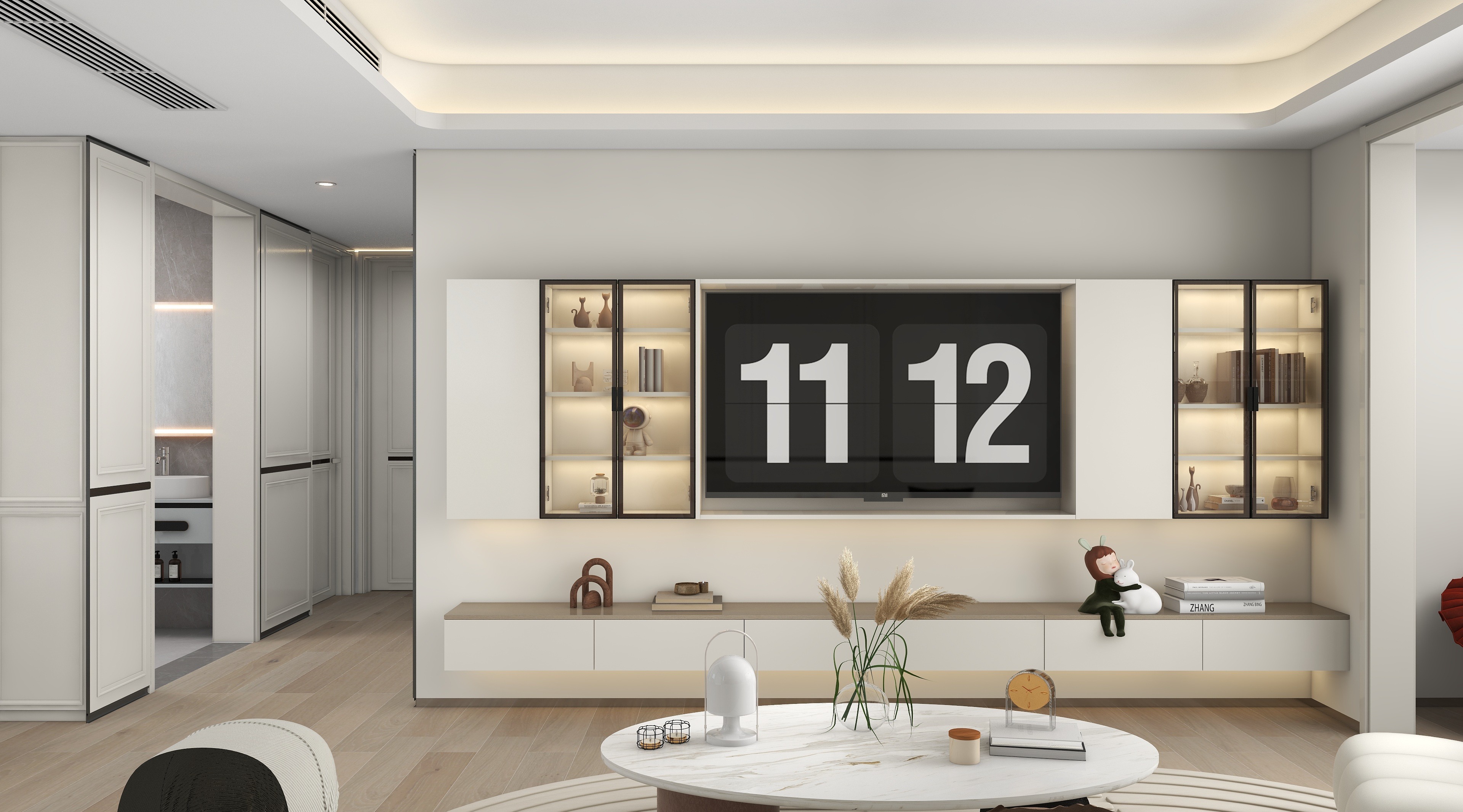 背景墙可根据家里的风格定制,一侧设置储物室格子,满足日常装饰品展示与收纳,提升空间的个性化。