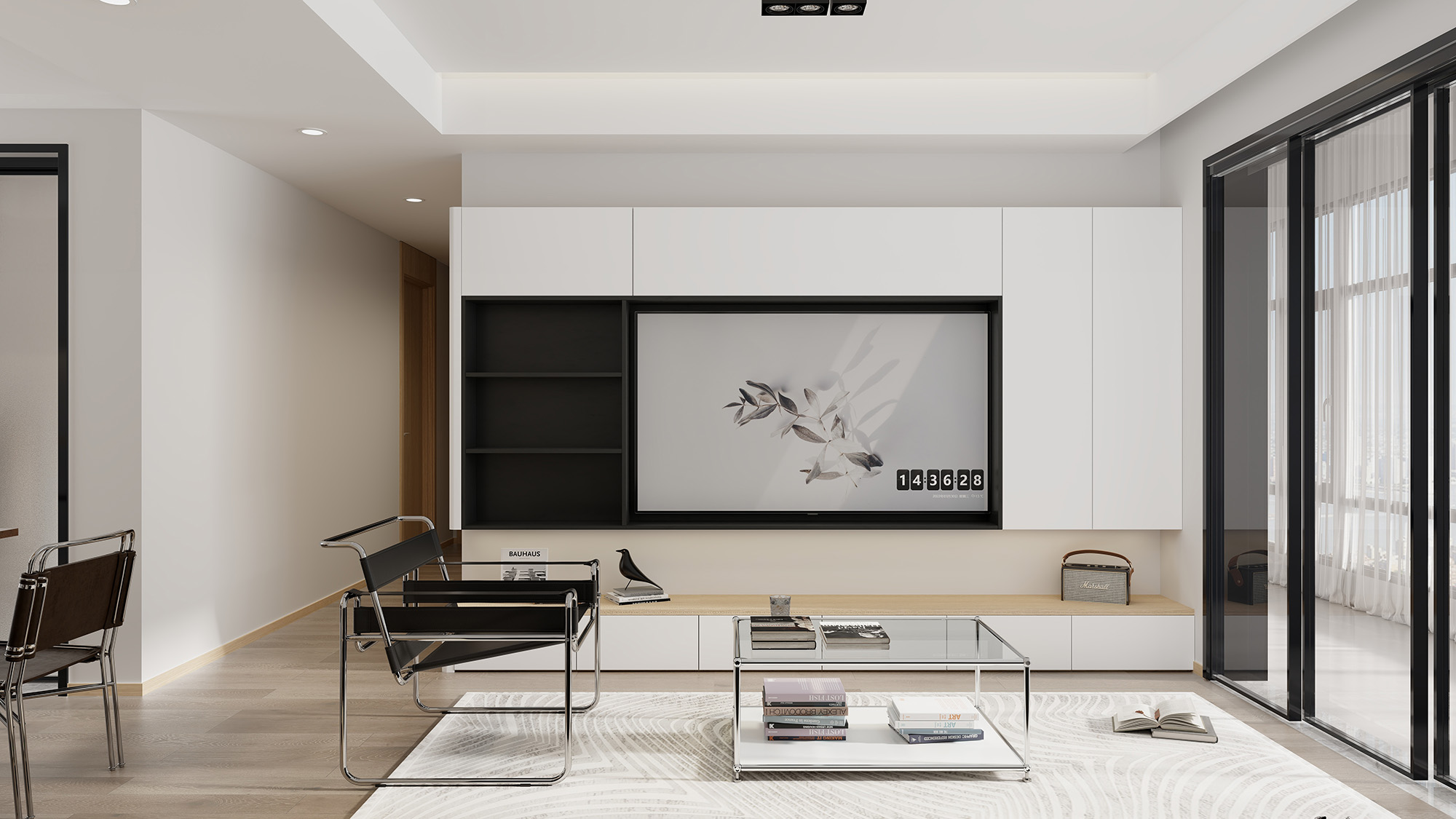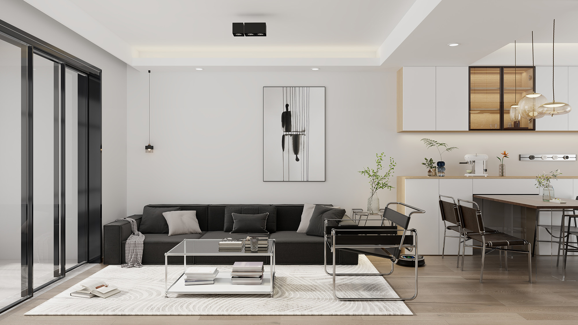 一侧通往阳台,选用了黑色的极简推拉门,极窄边框设计,整体视觉上的视野更加通透。搭配大面积的玻璃材质,客厅区域的采光效果也很好,大大提升了居住者都市生活的高品质体验。