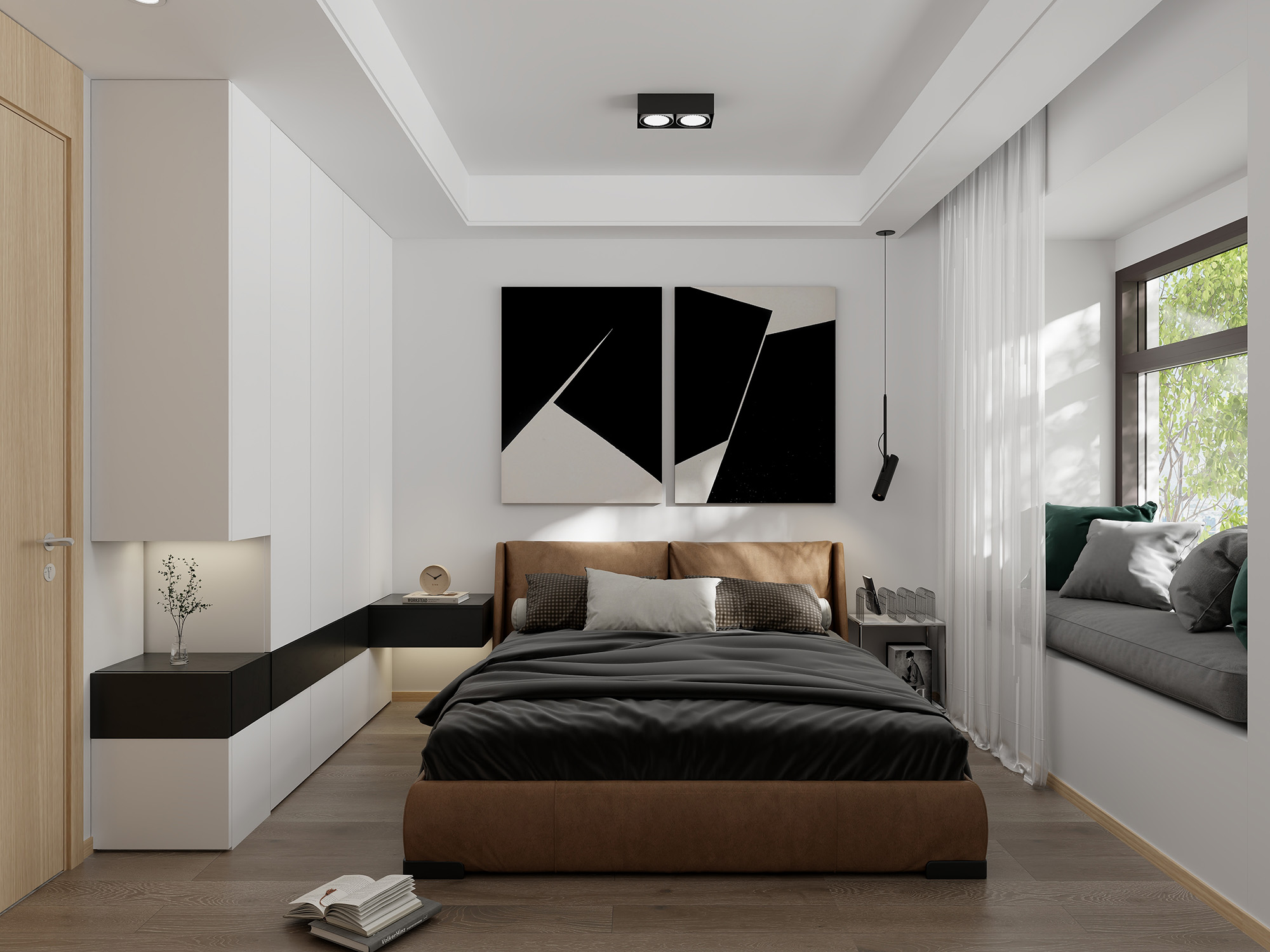 黑白极简风卧室搭配木质元素也很有温度,在繁忙的生活中找到一丝宁静。黑色调床品和床头柜,再加上一盏简约的侧吊灯,整个卧室的氛围瞬间变得温馨起来。卧室门选用TATA木门@001米橡色降噪门,