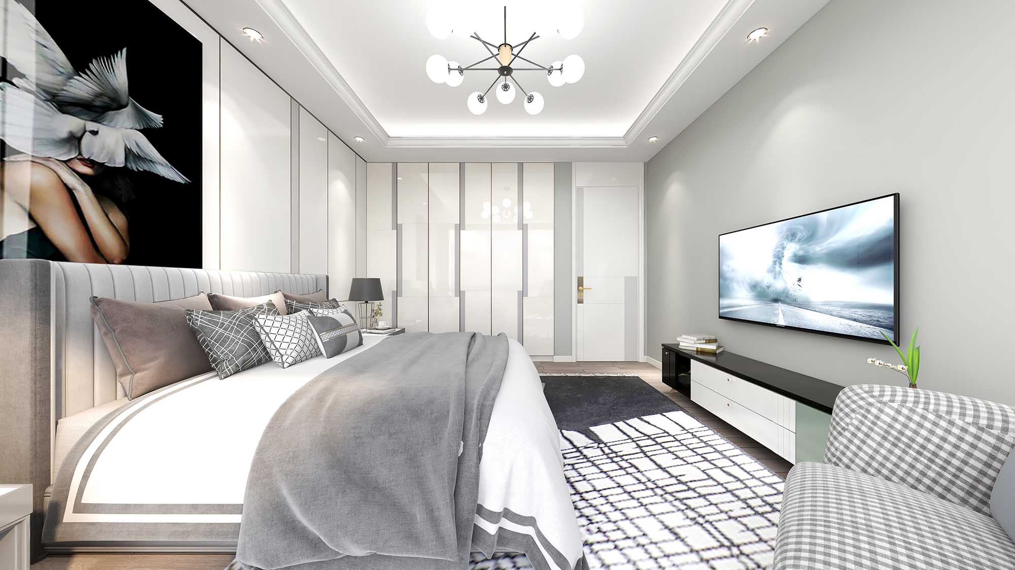 如果说客厅电视背景墙是个人审美的体现,那卧室背景墙则可以透露出一个人的内在。小TA觉得,在卧室背景墙上挂结婚照什么的,实在是太out了。那如何将时尚元素和背景墙结合呢?看看下面的效果图就够了。