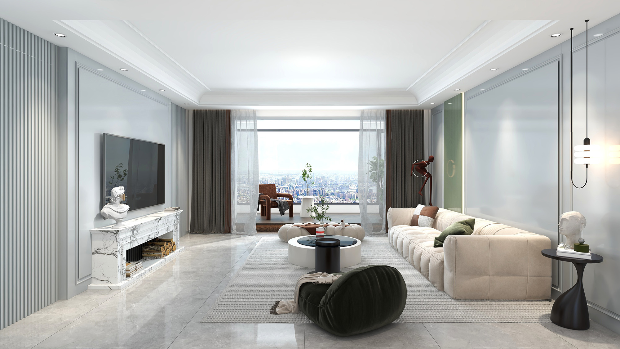 整体空间采用淡雅的简欧墙板,打造一个优雅的欧式轻奢主义空间。柔软的布艺沙发深浅不一 营造丰富的层次感。电视背景墙采用大理石地台打造 细腻的纹理散发的轻奢雅致的气息。