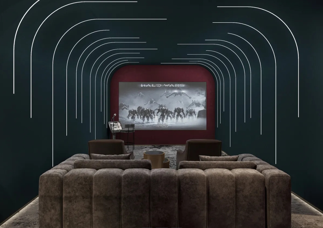 地下一楼另有影音房,设计具有先进的科技感和前卫感,线条的灯光设计将整个空间放大,深色背景,给人无限的沉浸感。沙发的包围感在阴暗的空间里给人以安全感,环绕音提供视听盛宴。