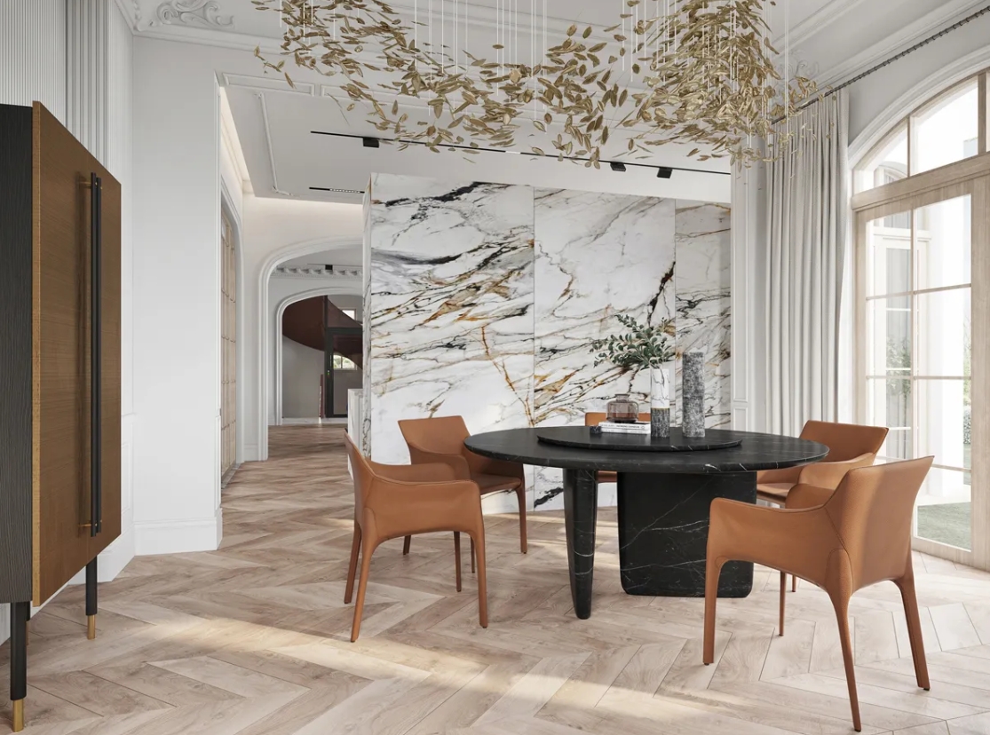 用的圆形餐桌,椅子也选择了具有弧线感的设计,在整个四方的空间里显得圆滑流畅,给人一种舒适的包容感。良好的采光使得经典的留白不会显得冰冷,辅之以顶部的装饰,打造出一种轻奢感,在现代与复古之间达到和谐的交融。这样的设计不仅不会显得杂乱拥挤,更致力于表达出空间的延伸感。