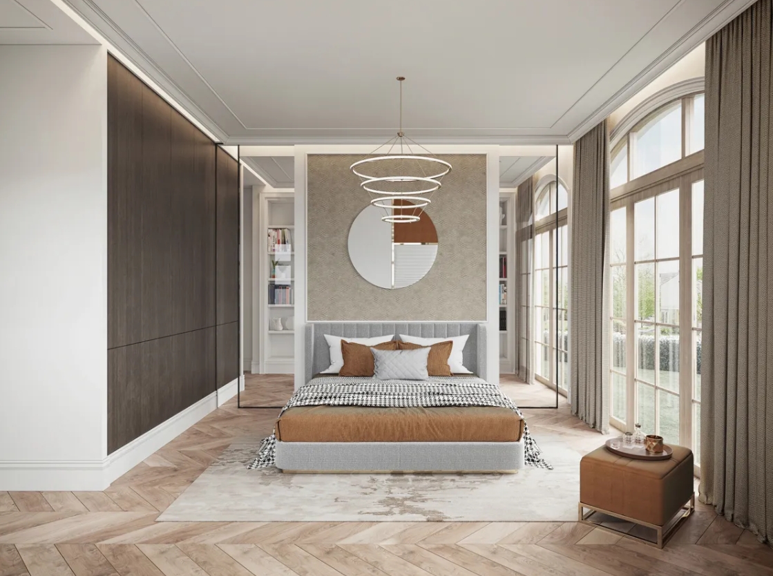 为了保证长辈活动便捷性与睡眠质量,我们把两个长辈房都布置在一楼,相对比较私密的空间,与客厅保持一定的距离。而且都拥有非常良好的通风采光,将户外的风景引入到室内空间,与自然合二为一。风格上我们尊重长辈的意见,采用了比较传统的新美式和美式风格,略显古朴高贵。