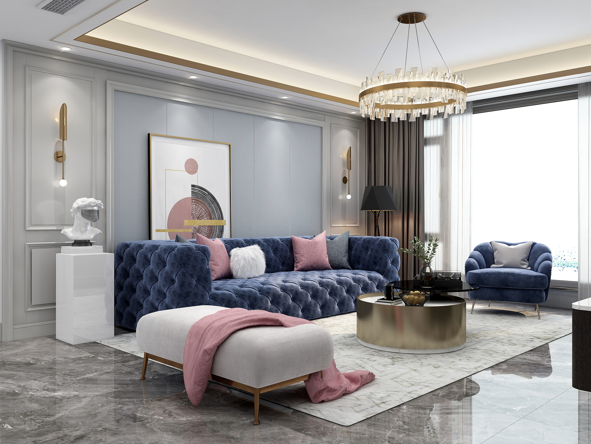齐柏林材质搭配精致细腻的典雅线条,使家里充满温馨舒适的气息,让人感受到一种轻松惬意的生活方式。家具选择具有浪漫气息的布艺与撞色单品,为空间增添一份优雅的情调。比如有绒感的沙发,几何图案的地毯、不同色系的毛毯与抱枕等。