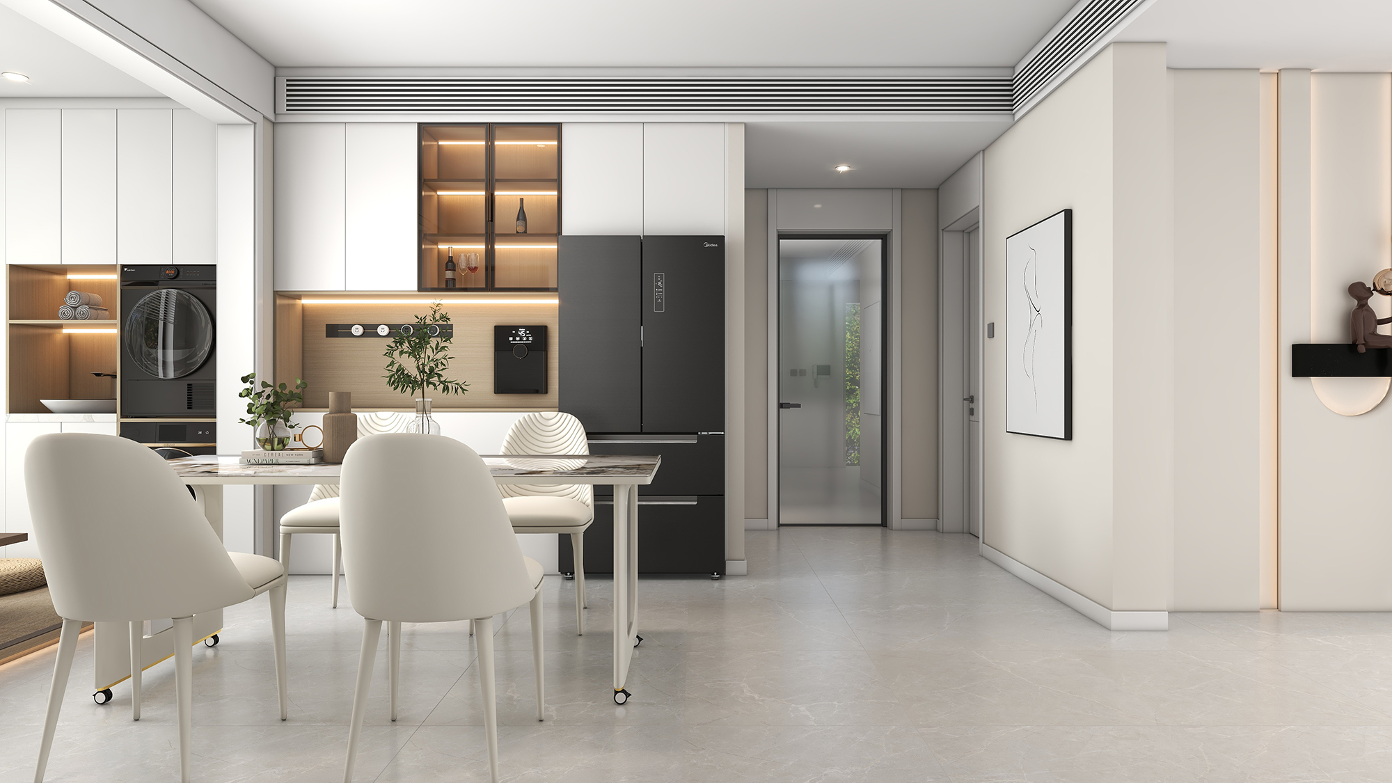 在全案设计中,暖色调起到了至关重要的作用。温暖的色彩如柔和的米黄等,为整个空间带来了一种宜人的氛围。
