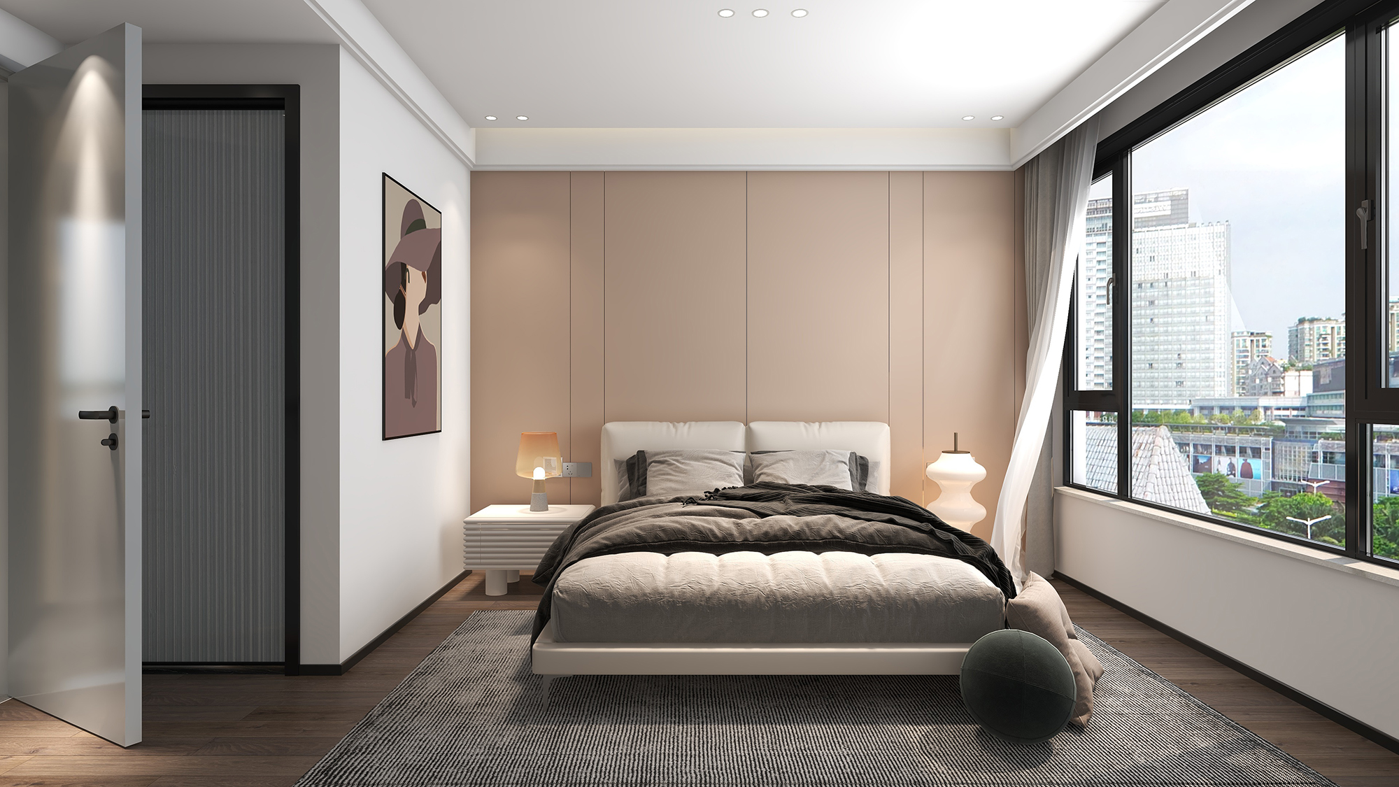 主卧中选用白色作为空间的主色调,床背景墙选用了粉色为这片白色空间增添了一抹色彩。高级的配色让空间中弥漫着静谧而安宁的氛围。