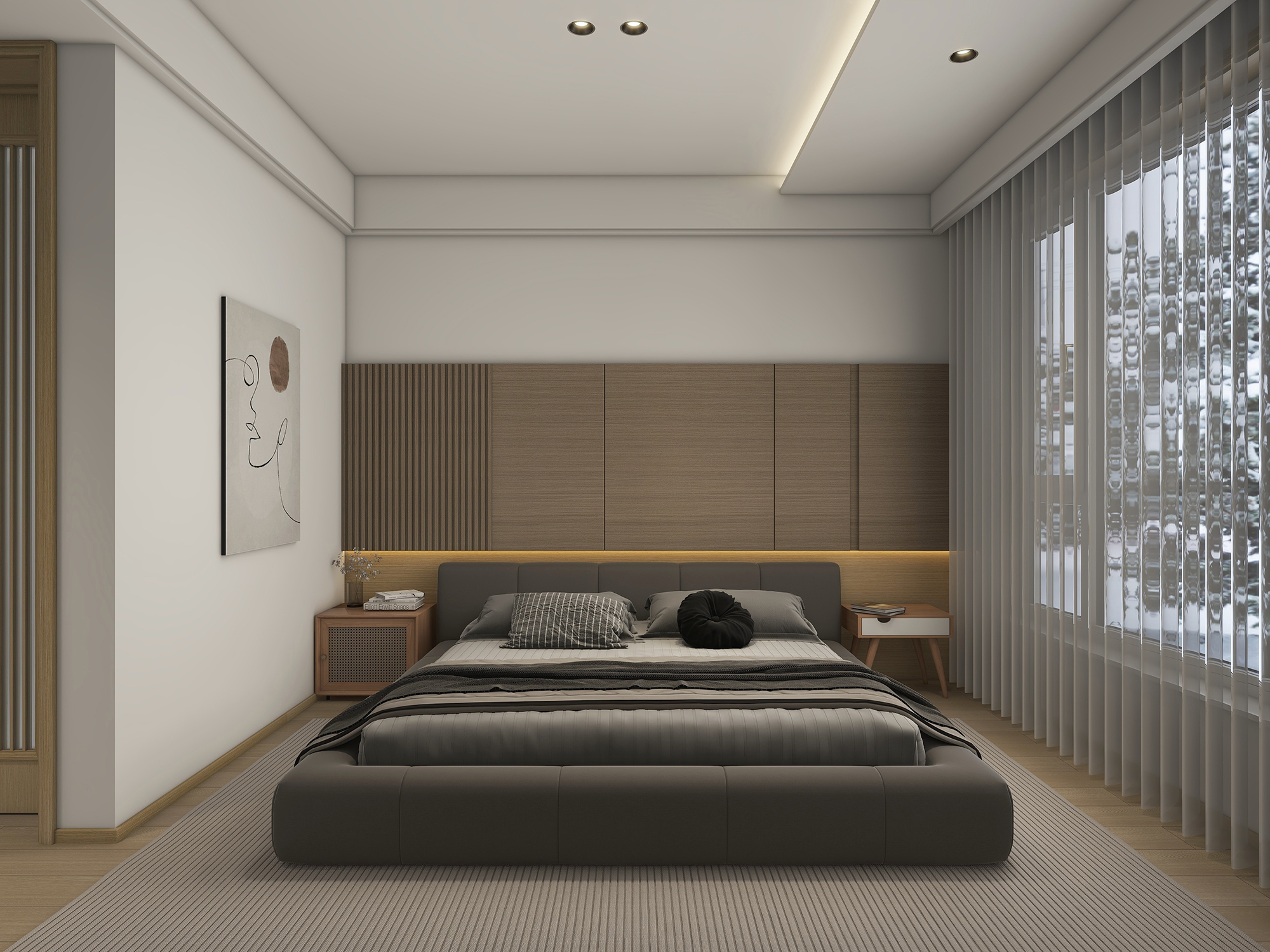 温馨的氛围仍在延续,原木背景墙和床头柜散发出自然感,给人一种安心和放松的体验。床选用灰色皮质,彰显主人的高品位,搭配柔软的棉麻被褥,简约而又舒适。一侧白墙墙上挂一幅当代主义画作,与整个空间相得益彰,增添了一丝艺术的气息。