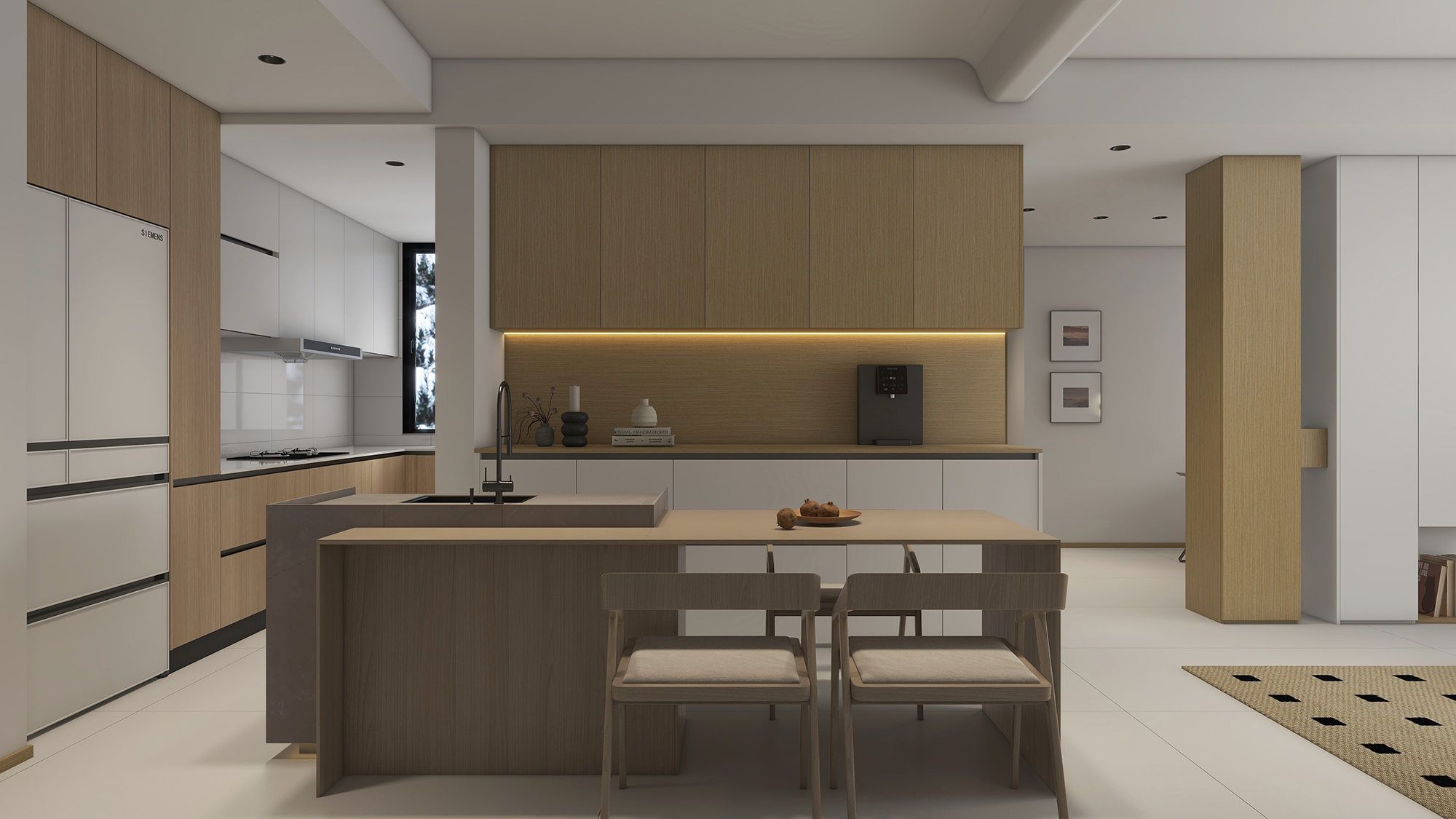 厨房餐厅做了敞开式设计,同样以原木为基调。橱柜和台面都是以原木纹理为设计元素,简洁而实用。同时配备了现代化的厨具设施,方便日常的烹饪和餐饮。秋野原橡材质的一体式柜体,与背景墙行程了呼应,颜值出挑又能满足日常收纳需求。