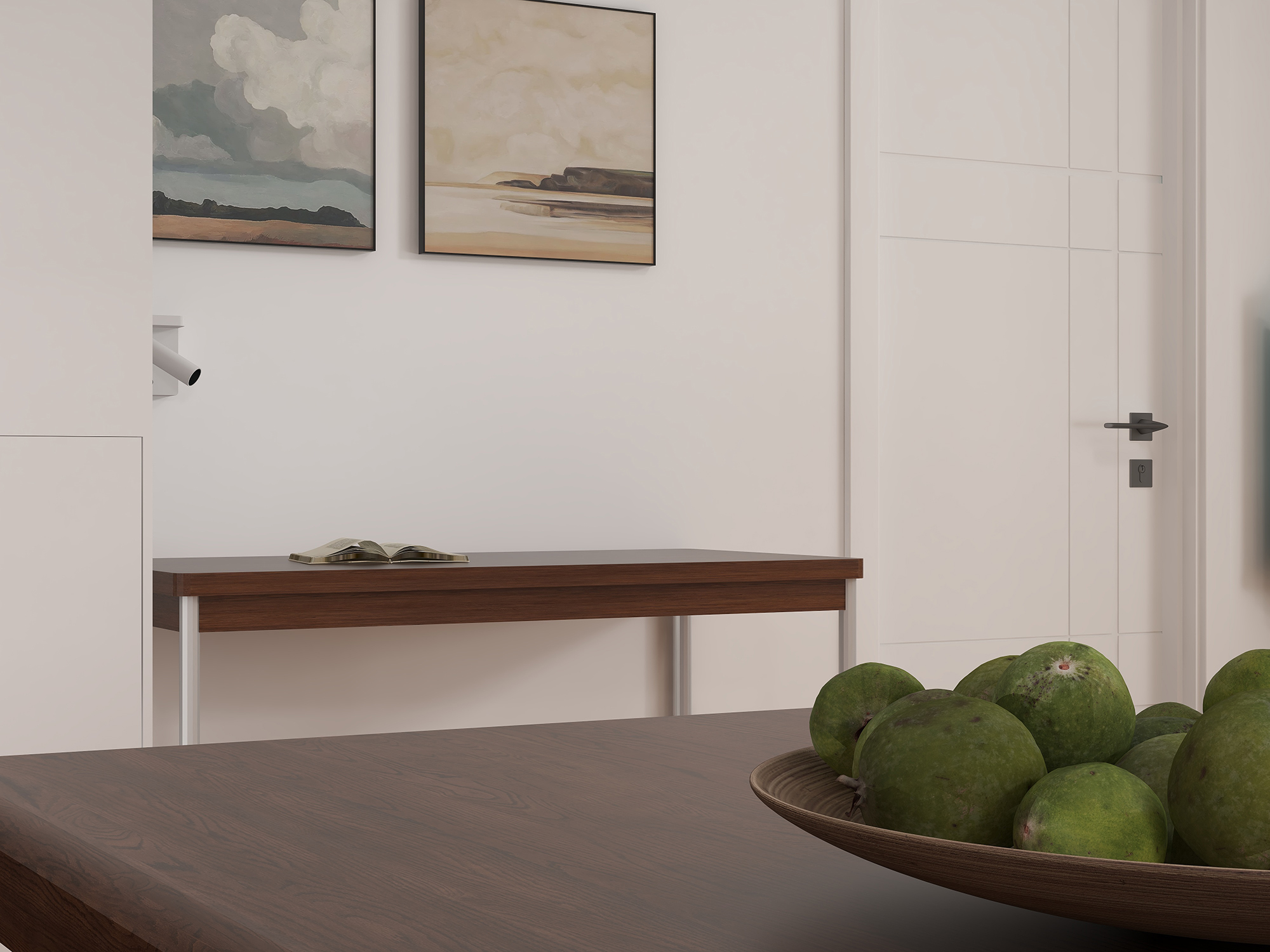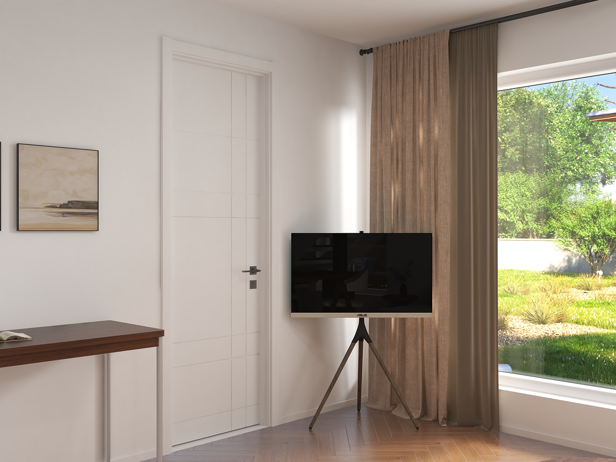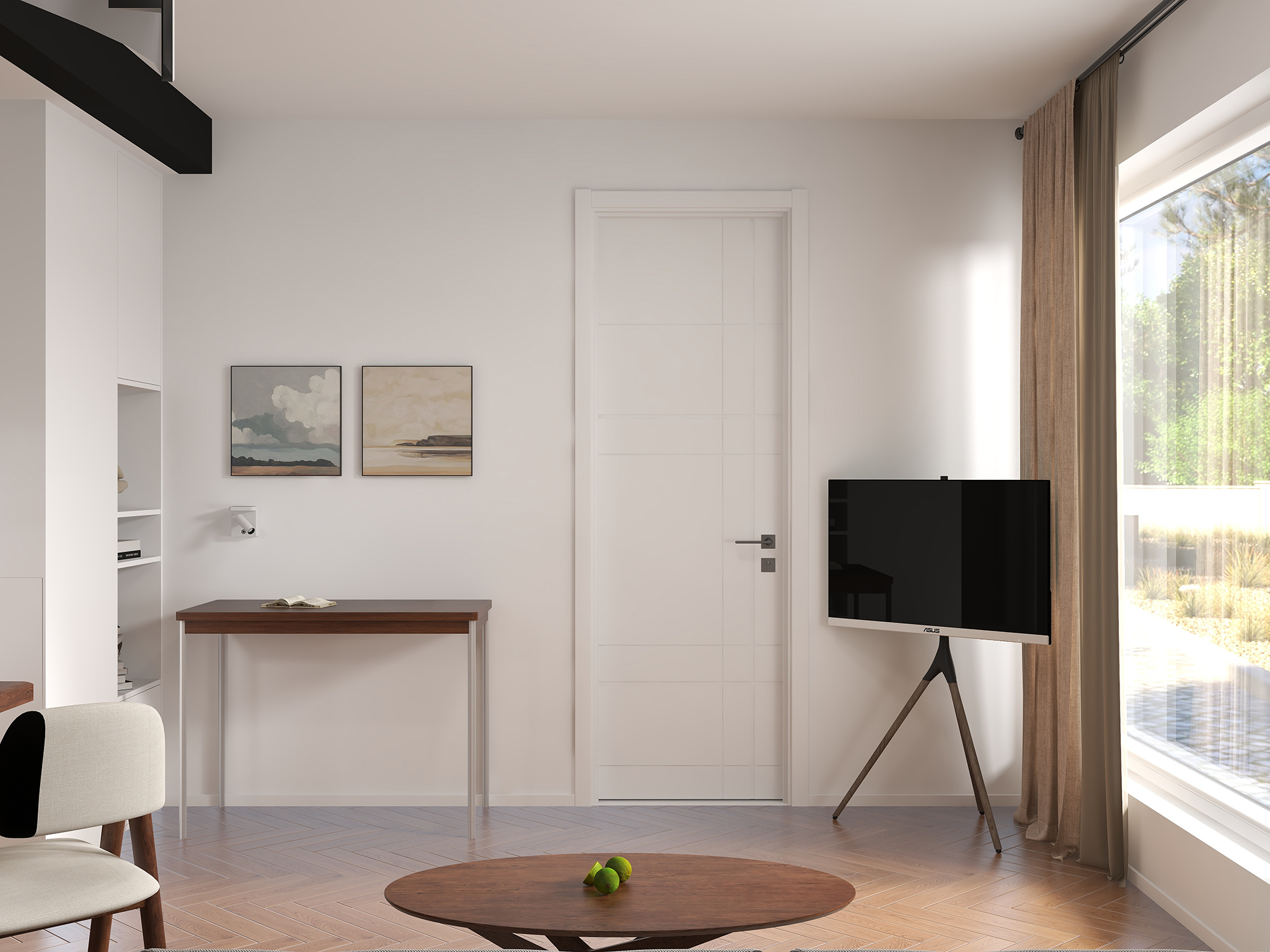 室内门选用TATA木门AC020降噪门,凹槽工艺的十字线条视觉上延伸了空间感,纯白色的门扇再搭配黑色执手,妥妥是百搭不出错的CP。45°斜口软磁吸设计与隐藏式锁舌设计,升华了开关门间的安静舒适体验。