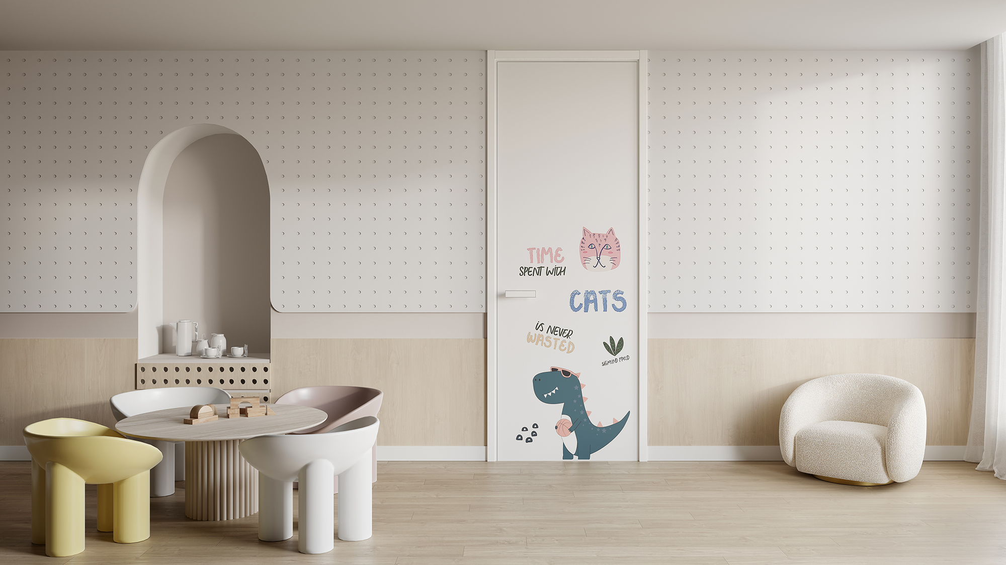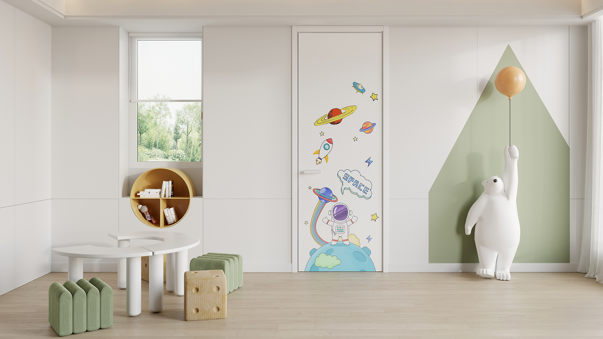 给予孩子自由释放的空间,可擦涂材质打破传统造型定义。一扇随意涂鸦的卧室门,肆意装下孩子们的奇思妙想。激发孩子想象力的同时,这样的设计也能增加家里的趣味性和个性化。