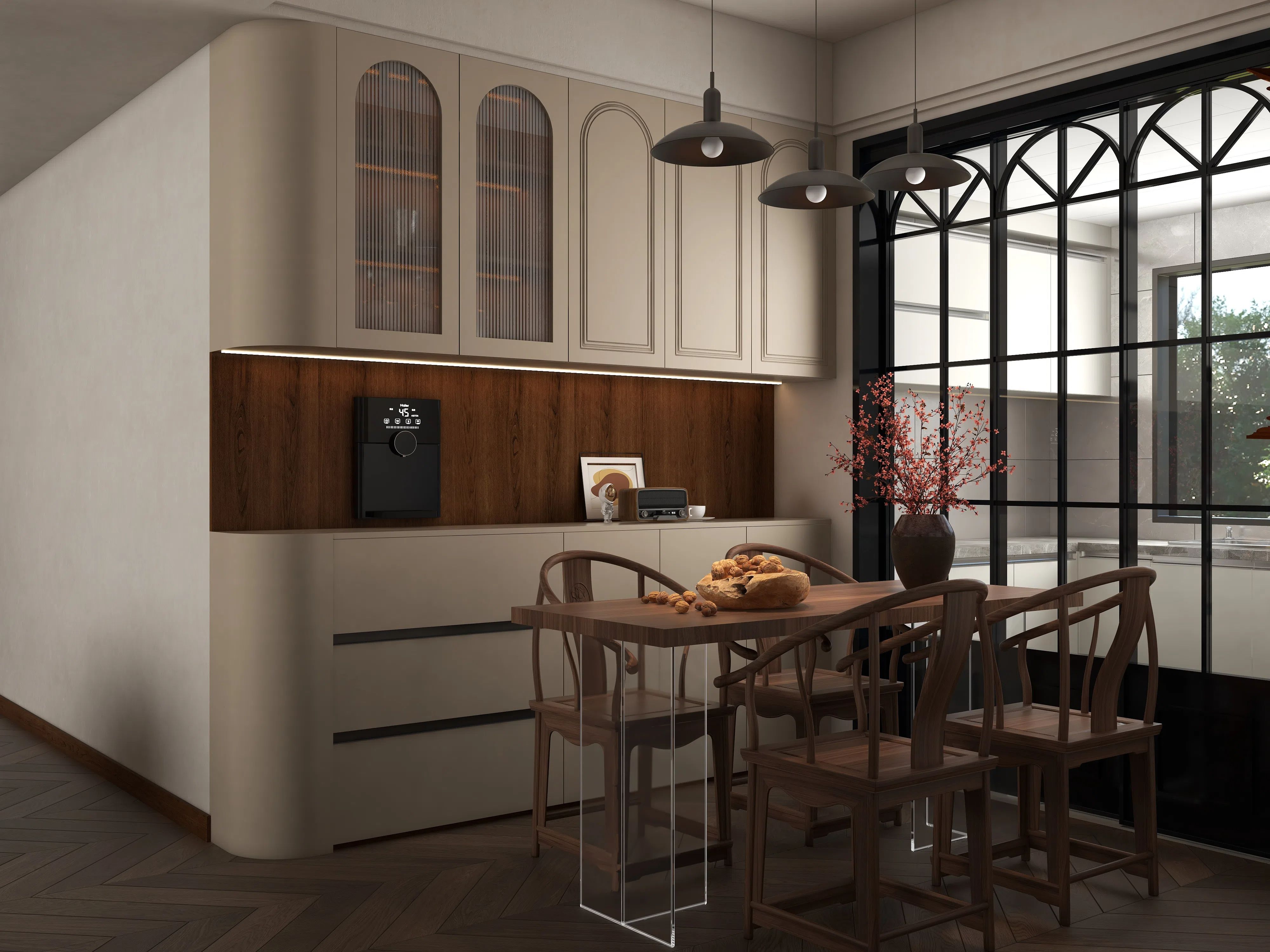 法式柜门设计作为餐边柜,加上复古的推拉门,以及木质的餐桌椅,每一处都是复古韵味的展现。当然也结合了现代的元素,如亚克力的桌脚,智能的家电等~