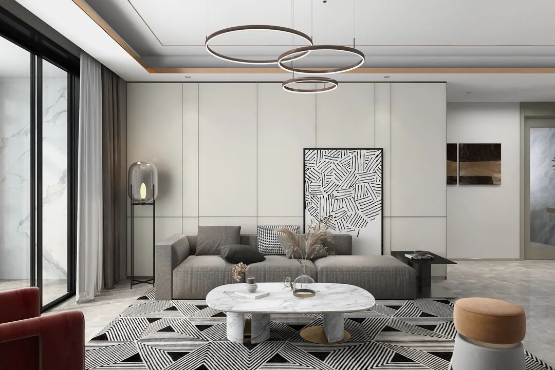软糯方正的深灰色沙发为客厅落下画面重心,白色背景墙前自然摆放的挂画与落地灯,轻松弱化了四白落地的单薄感,视觉瞬间变得丰盈。