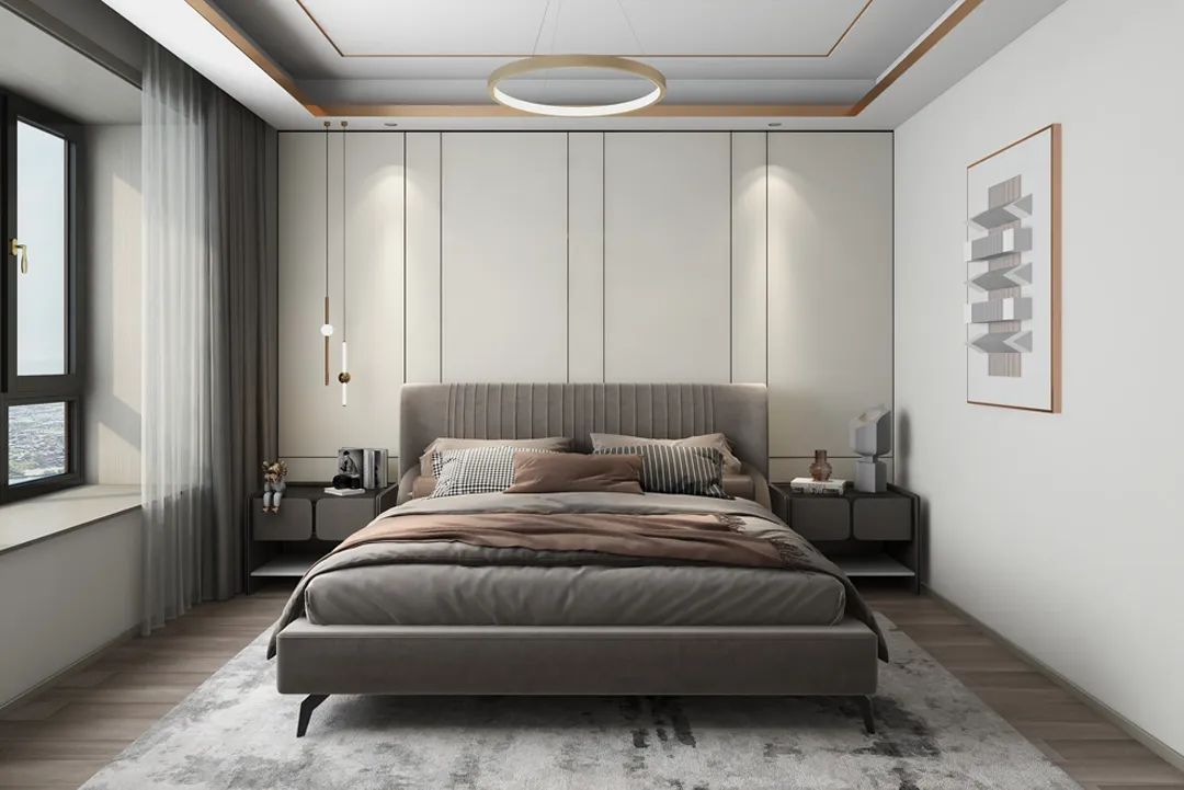 卧室均使用【PB-001白橡直纹】室内门,独特的45度斜口专利降噪技术时刻守护你静享美好生活。此外,卧室依旧延续了简洁实用的风格,并没有繁杂的造型与装饰,整体以米白两色为主色调,虽然没有宽大的落地窗,但飘窗的部位也并未出现隔断,保证了空间的通透感。床头背景墙上线条的流畅感与整体设计感,看似平平无奇,实际上却别有一番韵味。