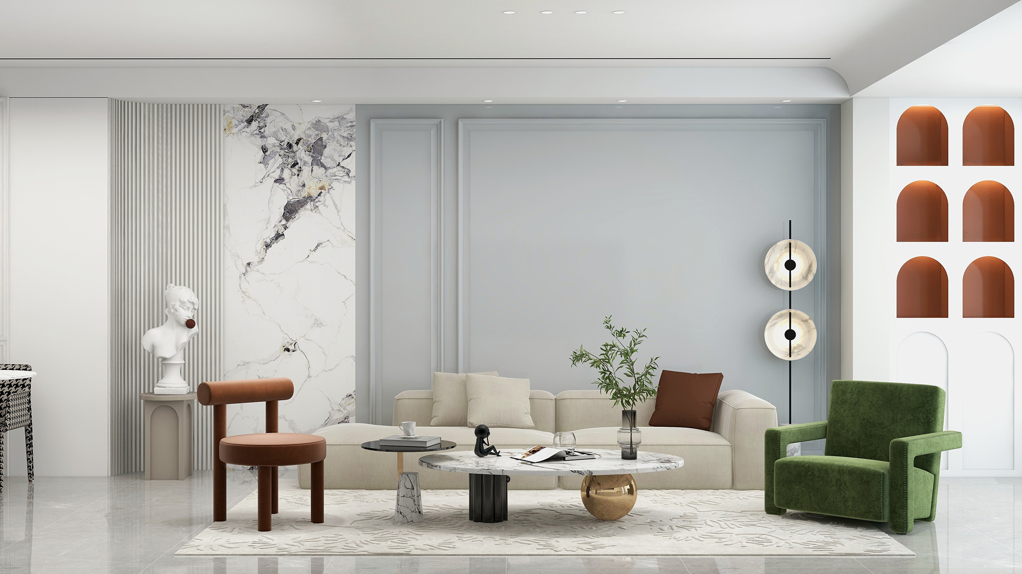 干净清爽的白色极简风,大面积白色干净、舒适,通透明亮的空间,开阔的空间,使得整体白色调更加明朗舒适,再配上一点点的莫兰迪系列橙色在增添了一些温馨与优雅。