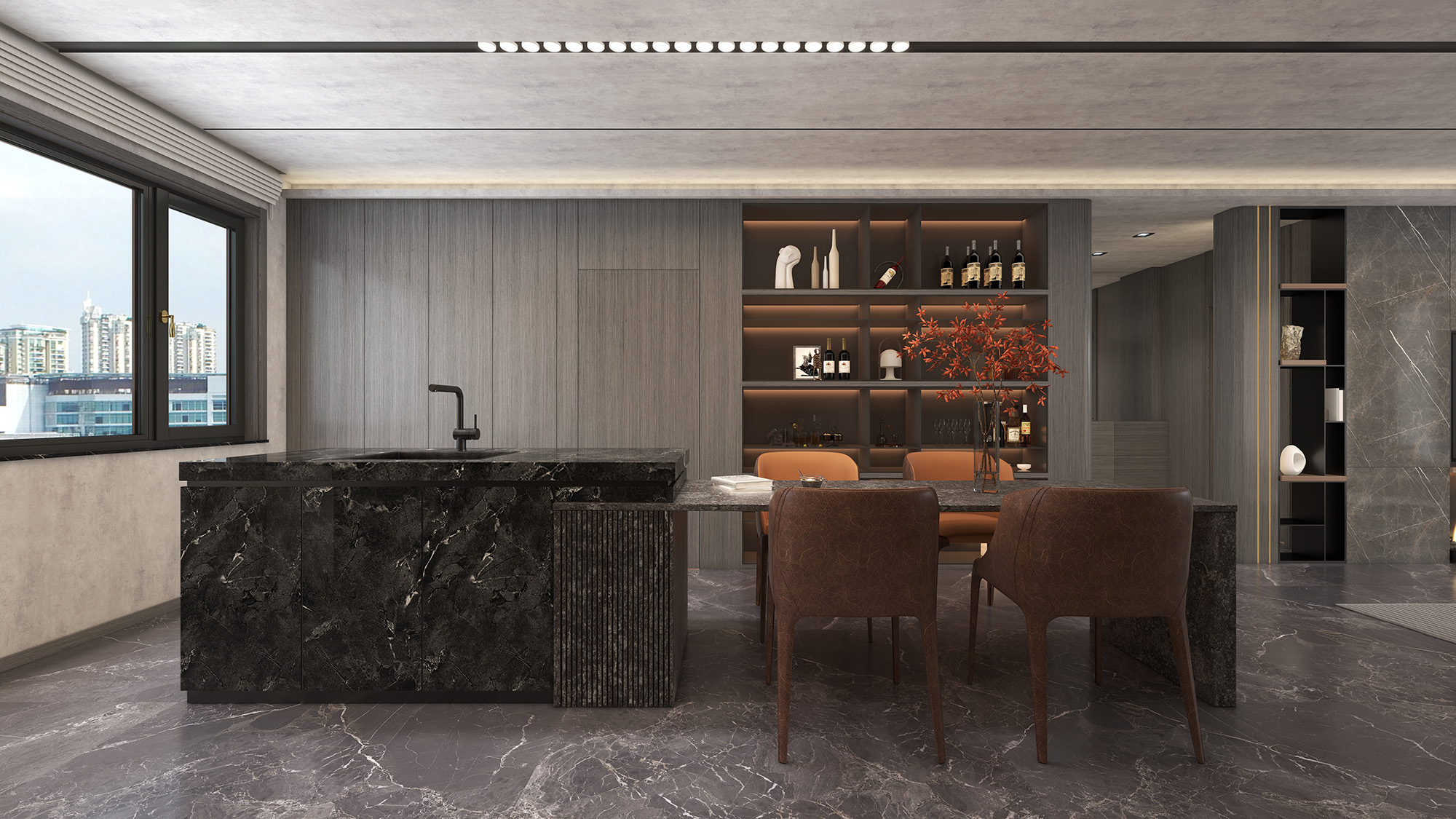 在空间中做减法,把设计本质更多体现在材质的选择与穿插构造的处理上,为每个空间创造特定的调色组合,以光、影互动为特征,洞悉发生在每一个静止物体间的磁场碰撞,让空间变得纯粹又孑然独立。