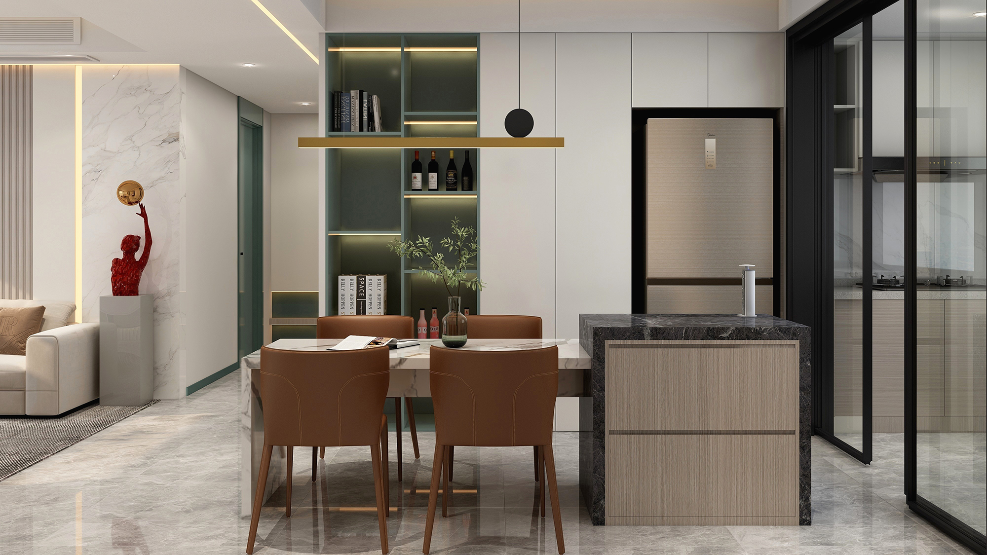 2023/05/14本期给大家分享168.8㎡轻奢风装修案例。设计师在客餐厅设置储物架,形成半敞开式隔断。餐厨之间同样采用玻璃推拉门来提高空间的通透度。利用流畅的动线安排,将不同的功能空间区分开来,同时保持着空间之间的相互交流,保持着整体空间的一致性。