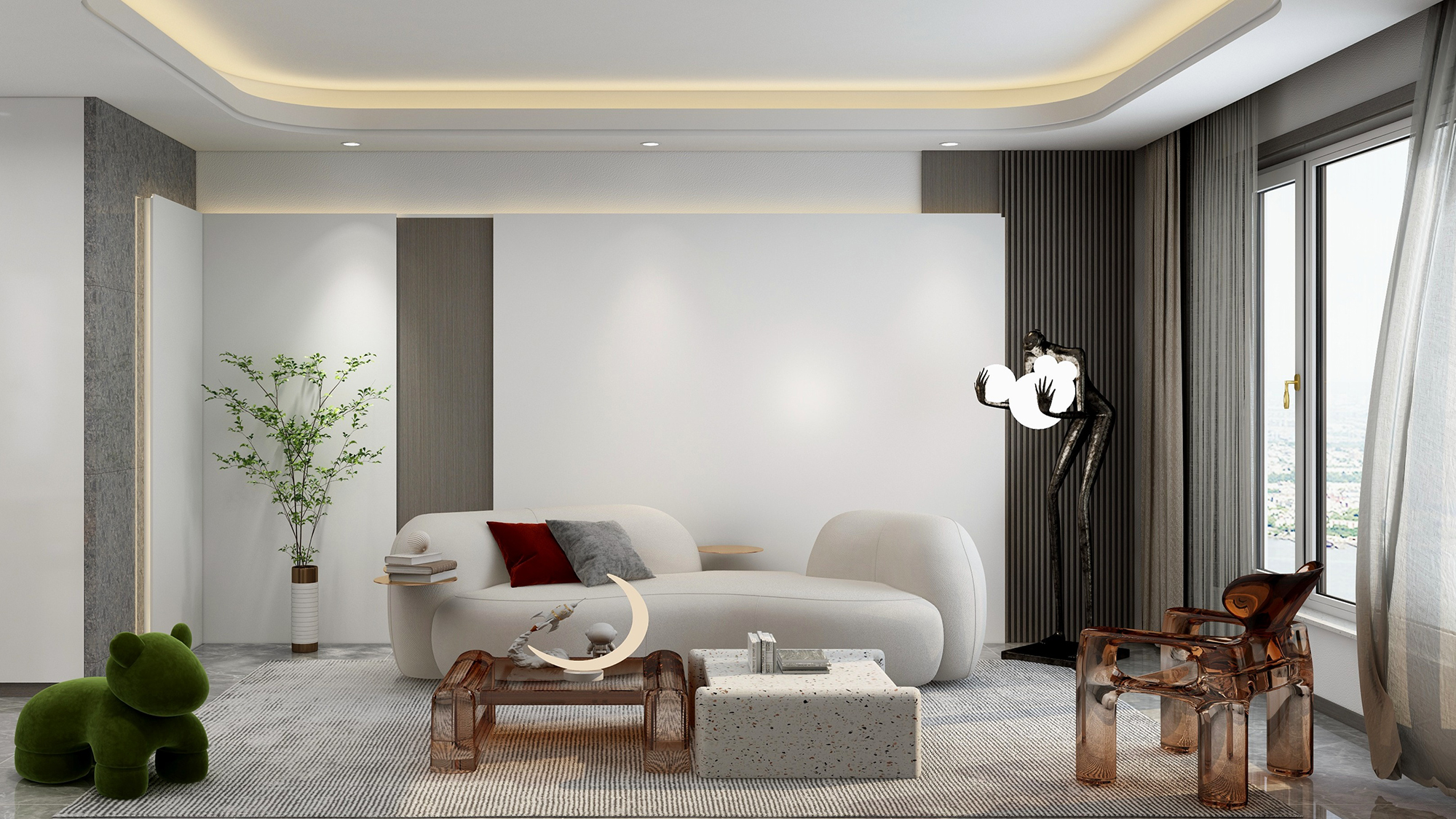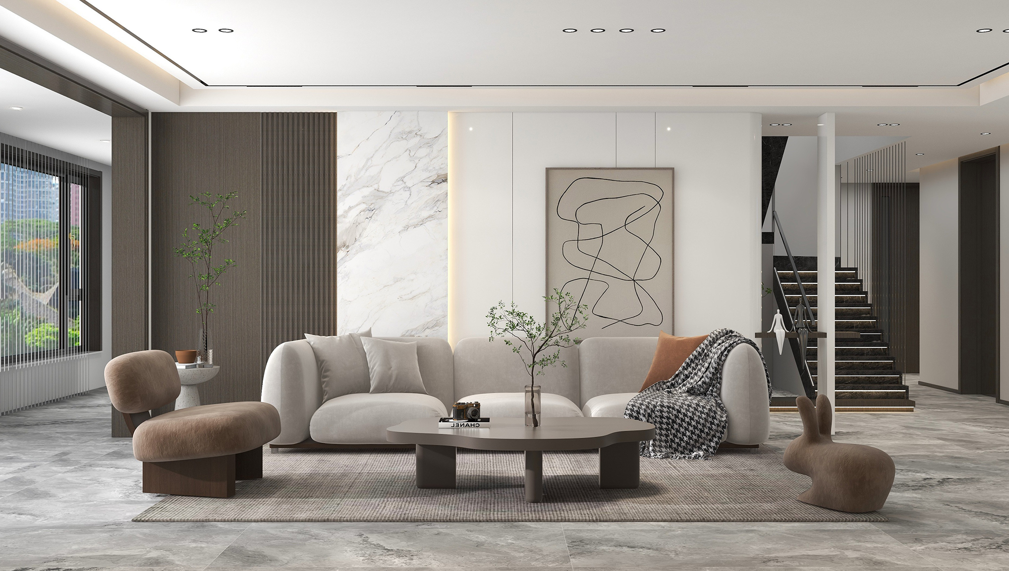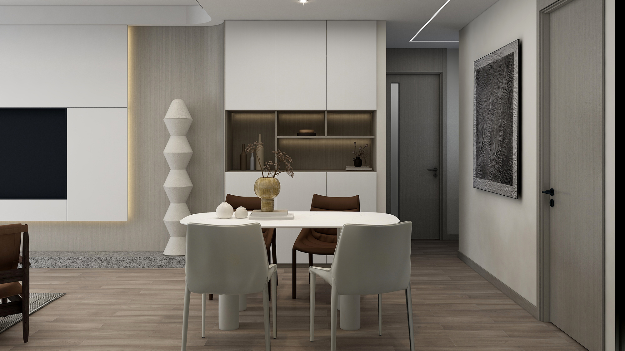本案无论材质、色调还是风格,都剥离了富丽繁华的视觉表达,无主灯的设计,让空间更加简洁没有厚重感,富有艺术格调的软装陈设则增添一丝婉约柔美,朦胧之中彰显理性的优雅。
