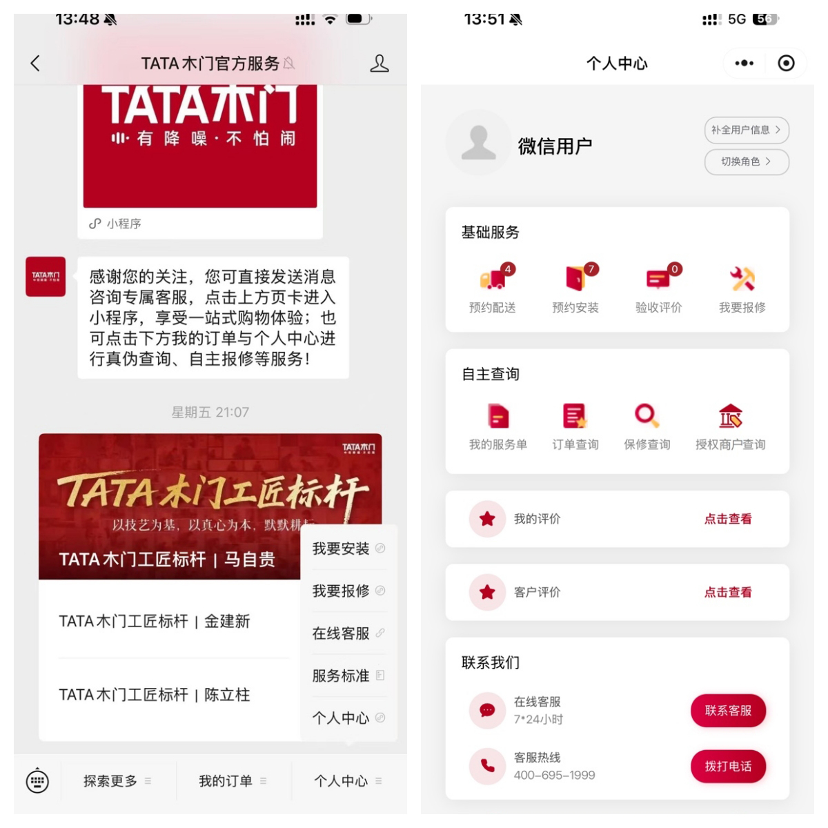 3.1在TATA木门官方服务号中[个人中心]-[我要报修]中,发起报修(问题描述中编辑核心问题);或者,拨打官方400热线400-695-1999,提供质保凭证(订单手机号、销售合同、质保卡等),发起报修(提报问题产品图片,描述核心问题)。