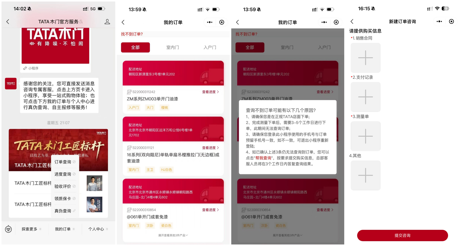 1.2关注TATA木门官方服务,可在我的订单中查询进度及详情,因定制品下单需要周期及现场条件,当系统查询不到订单时,优先向门店咨询订单进度,也可在[我的订单]中点击—[找不到订单]—[帮我查询]上传标准资料(销售合同、支付记录、测量单)--[点击提交],后台有品牌公司专人跟进。